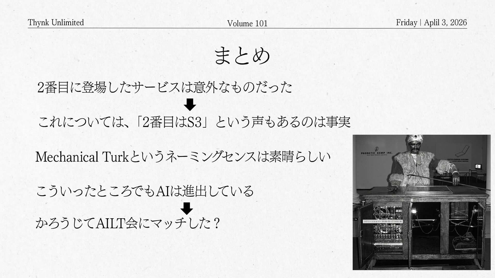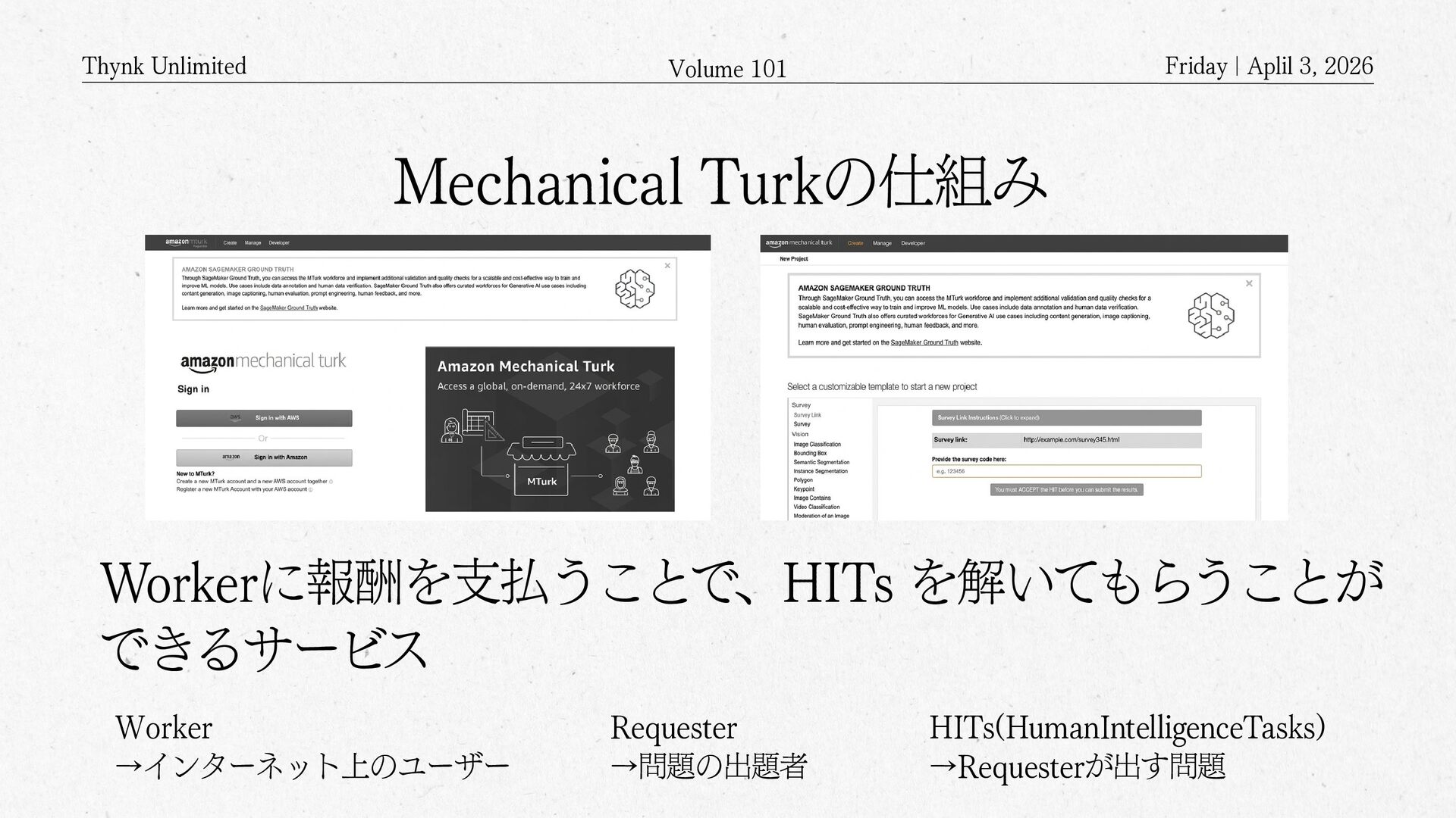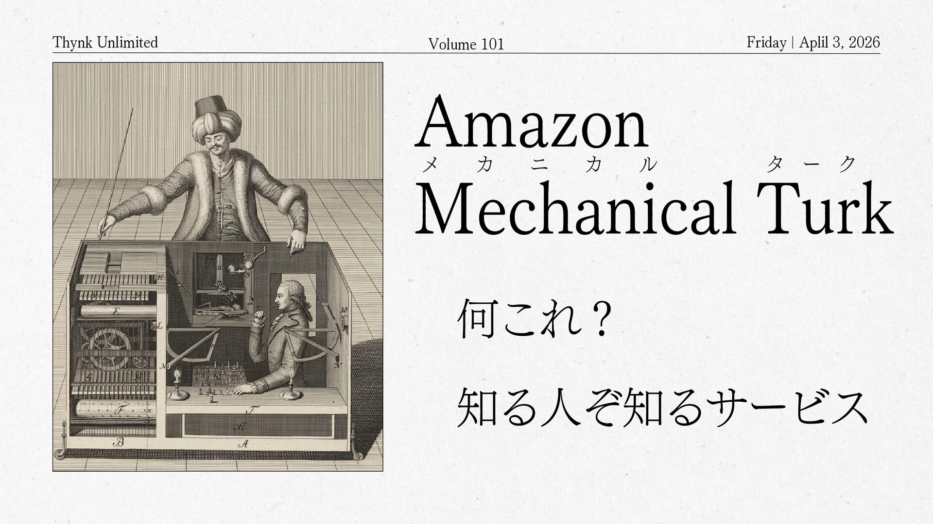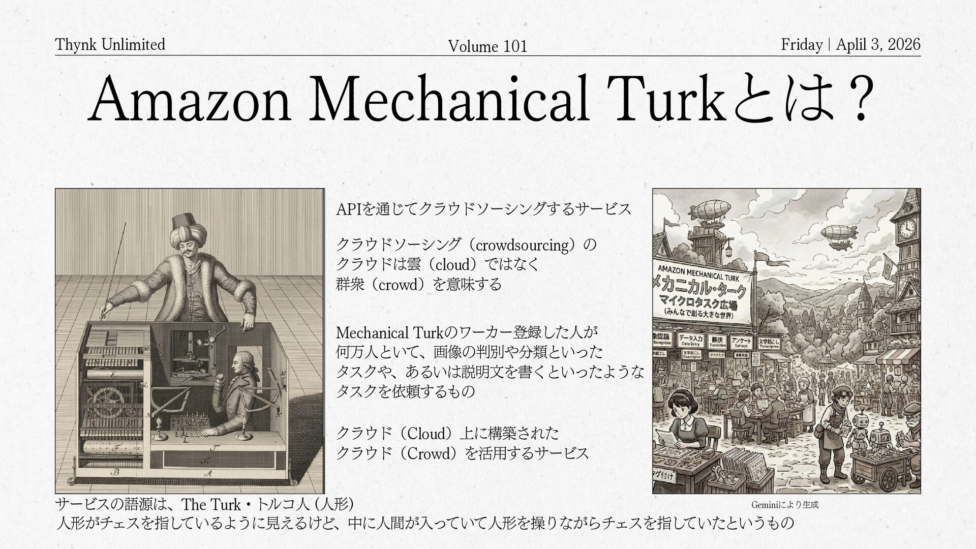 2026 Amazon Mechanical Turkとは? APIを通じてクラウドソーシングするサービス クラウドソーシング(crowdsourcing)の クラウドは雲(cloud)ではなく 群衆(crowd)を意味する Mechanical Turkのワーカー登録した人が 何万人といて、画像の判別や分類といった タスクや、あるいは説明文を書くといったような タスクを依頼するもの クラウド(Cloud)上に構築された クラウド(Crowd)を活用するサービス サービスの語源は、The Turk・トルコ人 (人形) 人形がチェスを指しているように見えるけど、中に人間が入っていて人形を操りながらチェスを指していたというもの Geminiにより生成