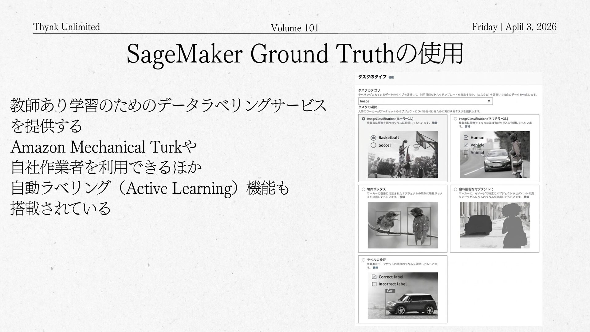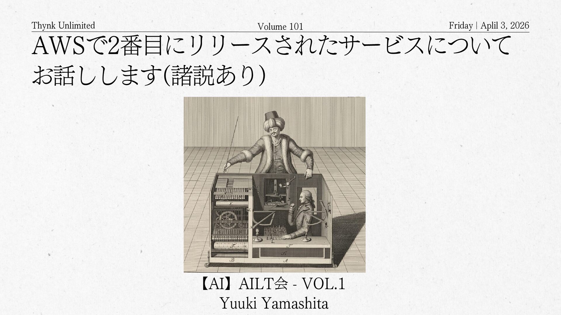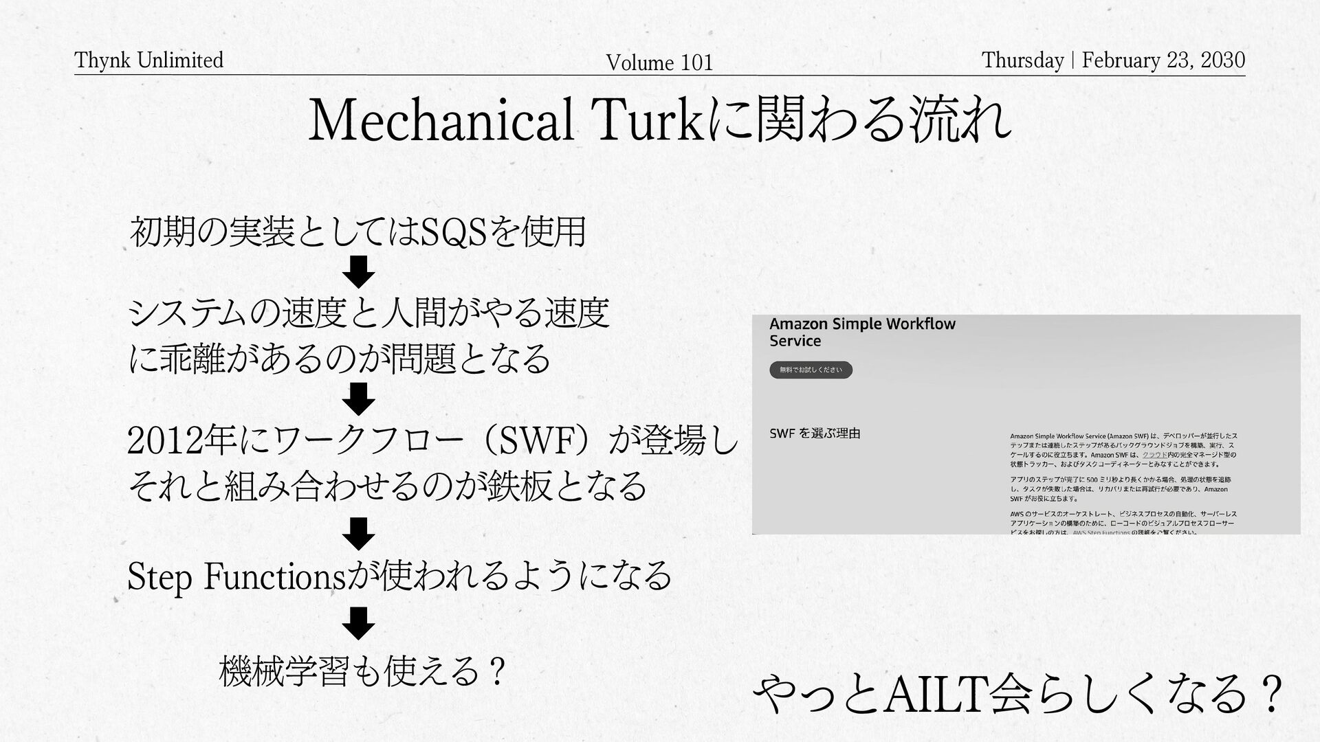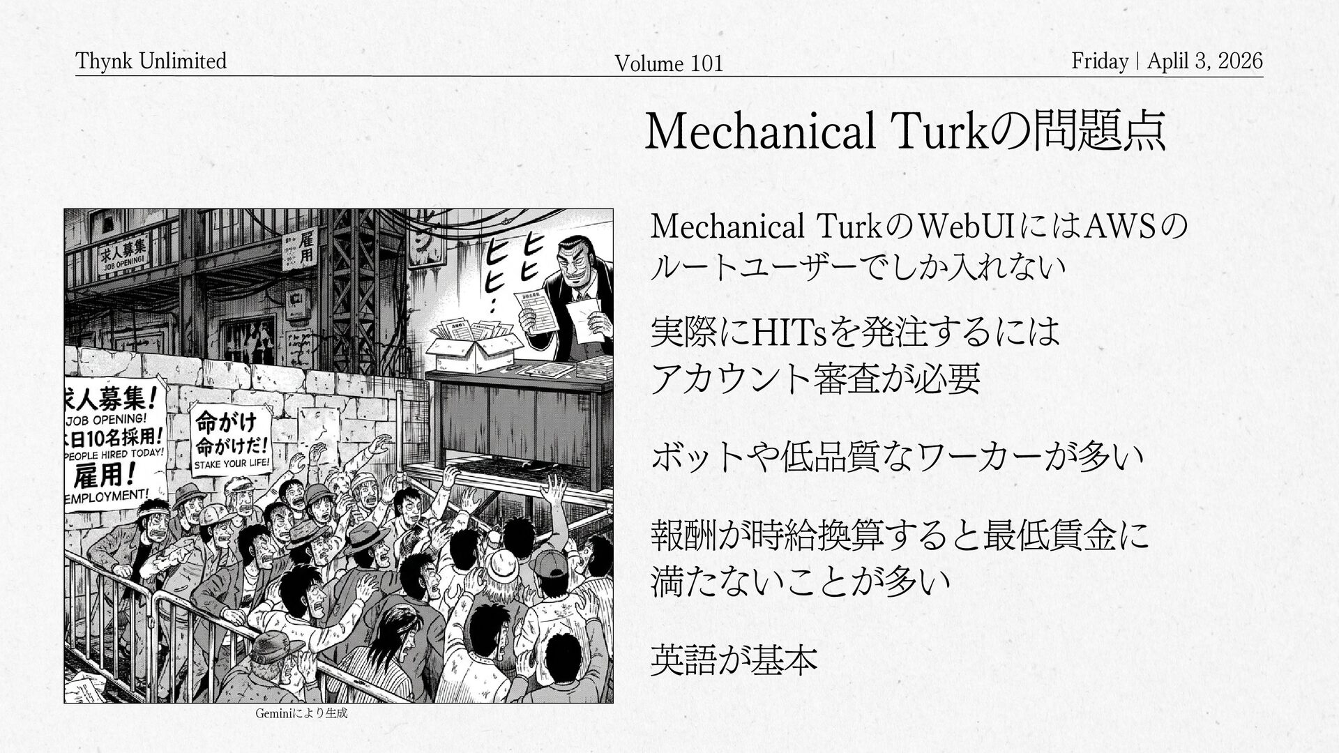 2026 Amazon Mechanical Turkとは? APIを通じてクラウドソーシングするサービス クラウドソーシング(crowdsourcing)の クラウドは雲(cloud)ではなく 群衆(crowd)を意味する Mechanical Turkのワーカー登録した人が 何万人といて、画像の判別や分類といった タスクや、あるいは説明文を書くといったような タスクを依頼するもの クラウド(Cloud)上に構築された クラウド(Crowd)を活用するサービス サービスの語源は、The Turk・トルコ人 (人形) 人形がチェスを指しているように見えるけど、中に人間が入っていて人形を操りながらチェスを指していたというもの Geminiにより生成