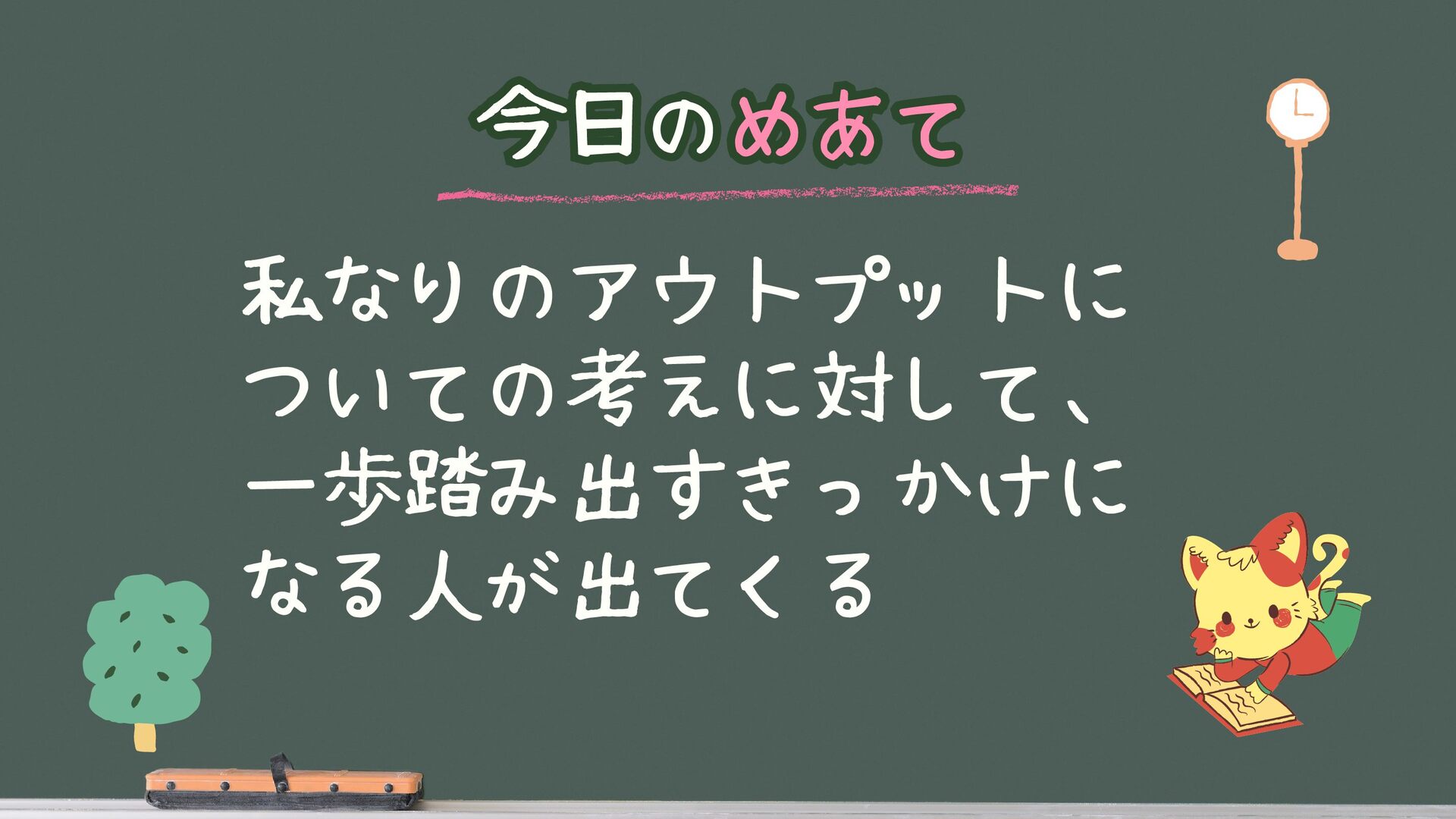 私なりのアウトプットに ついての考えに対して、 一歩踏み出すきっかけに なる人が出てくる 今日の 今日のめあて めあて 今日のめあて