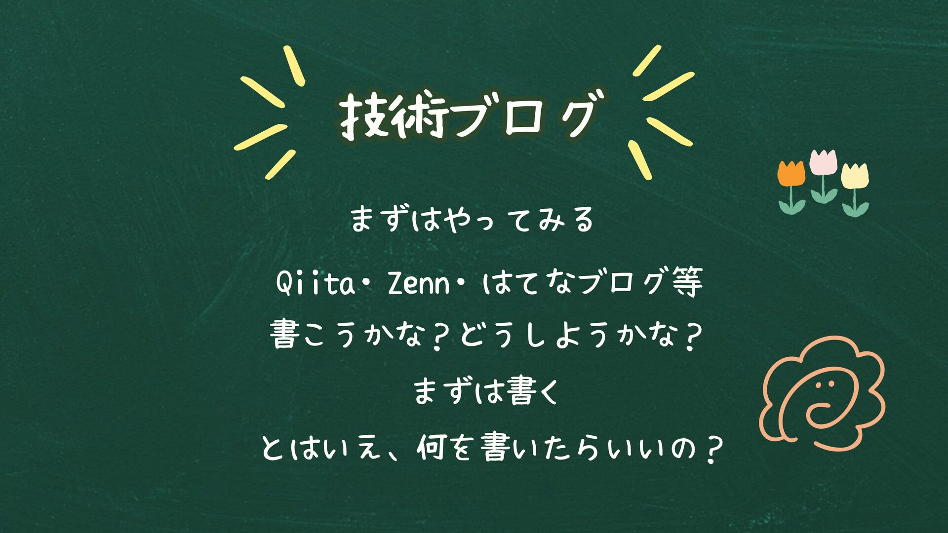 まずはやってみる 技術ブログ 技術ブログ 技術ブログ Qiita・Zenn・はてなブログ等 書こうかな?どうしようかな? まずは書く とはいえ、何を書いたらいいの?