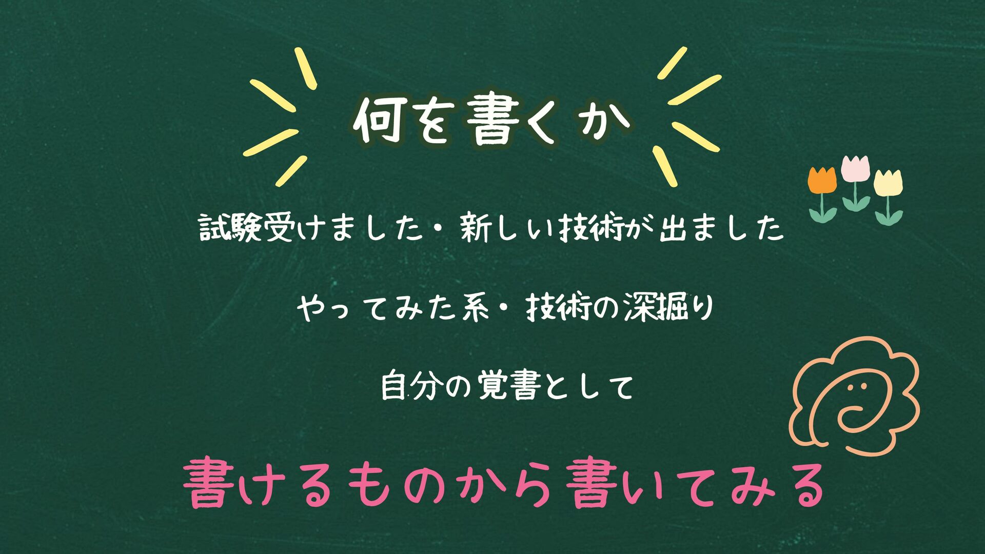 試験受けました・新しい技術が出ました 何を書くか 何を書くか 何を書くか やってみた系・技術の深掘り 書けるものから書いてみる 自分の覚書として