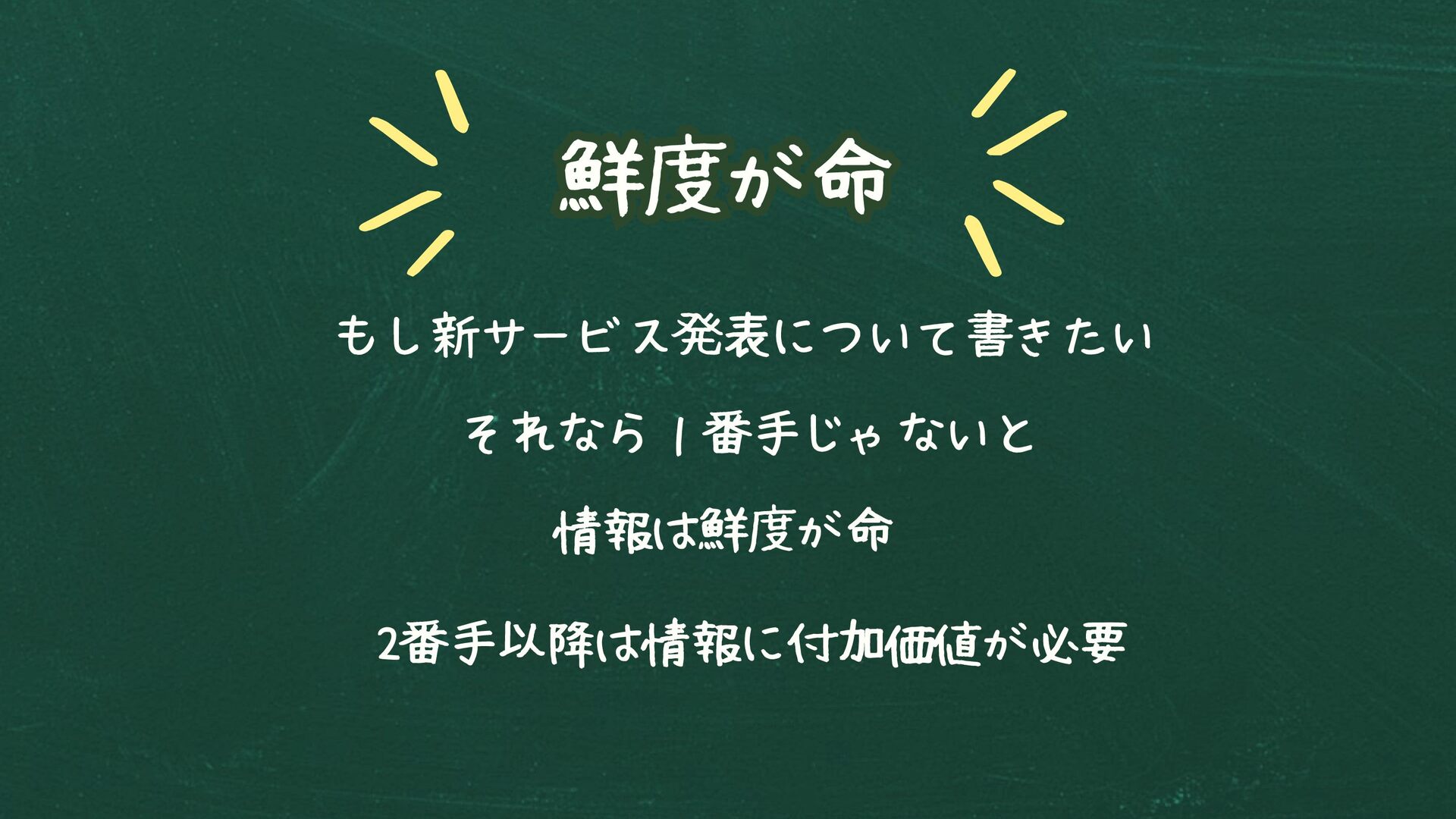 もし新サービス発表について書きたい 鮮度が命 鮮度が命 鮮度が命 それなら1番手じゃないと 情報は鮮度が命 2番手以降は情報に付加価値が必要
