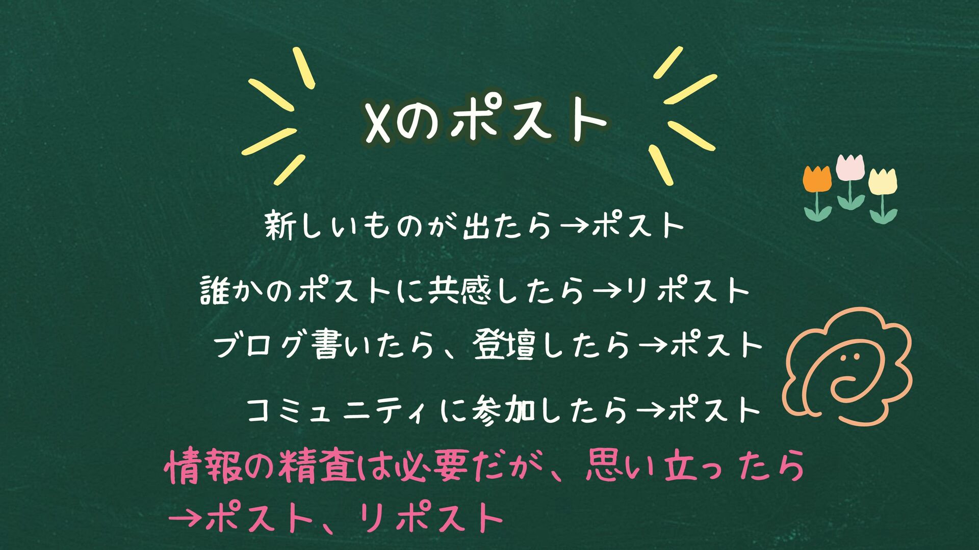 新しいものが出たら→ポスト Xのポスト Xのポスト Xのポスト 誰かのポストに共感したら→リポスト ブログ書いたら、登壇したら→ポスト コミュニティに参加したら→ポスト 情報の精査は必要だが、思い立ったら →ポスト、リポスト