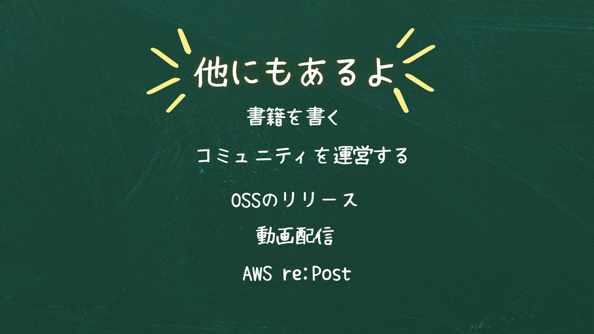 書籍を書く 他にもあるよ 他にもあるよ 他にもあるよ コミュニティを運営する 動画配信 AWS re:Post OSSのリリース