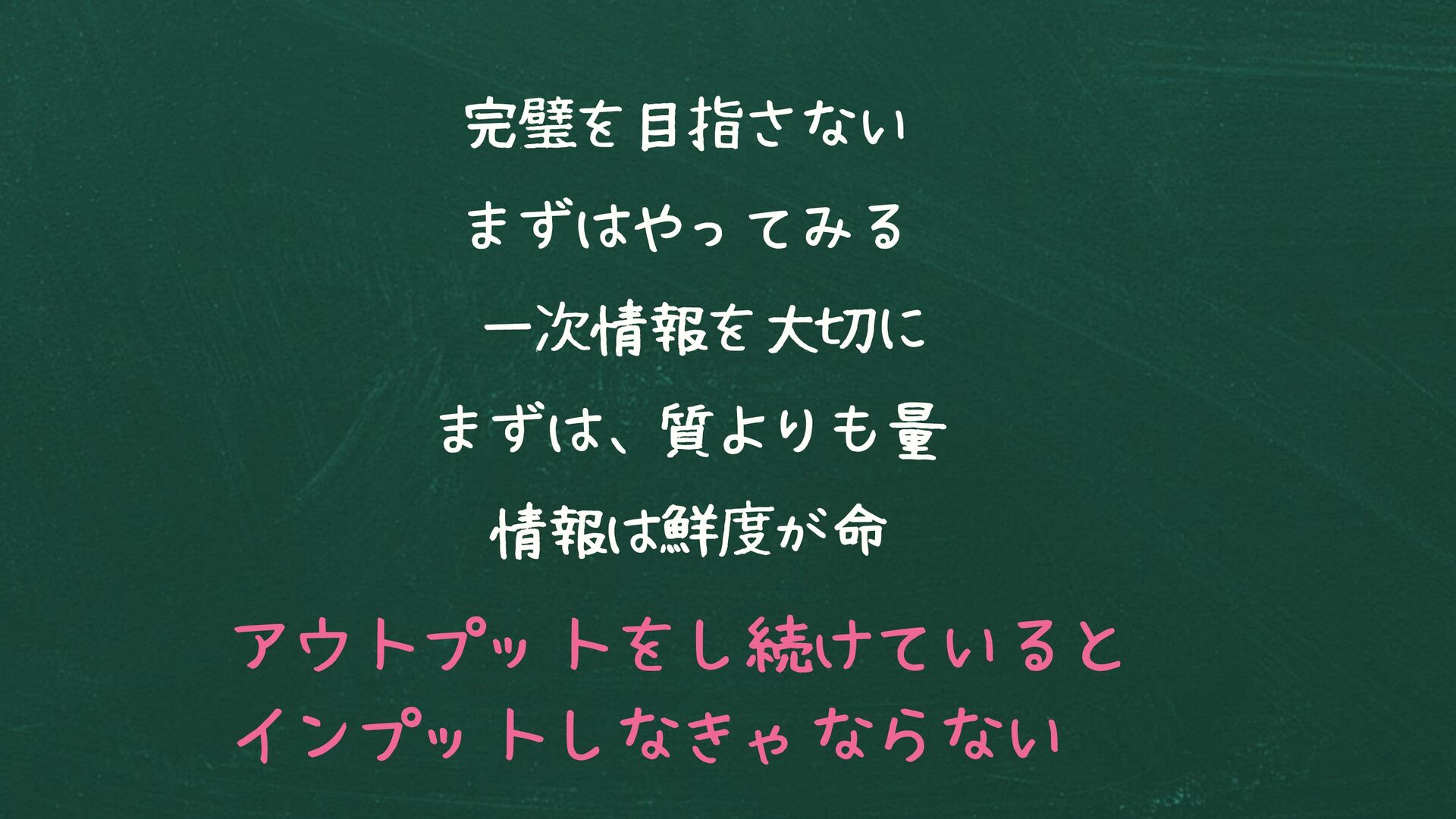 完璧を目指さない まずはやってみる 一次情報を大切に まずは、質よりも量 情報は鮮度が命 アウトプットをし続けていると インプットしなきゃならない