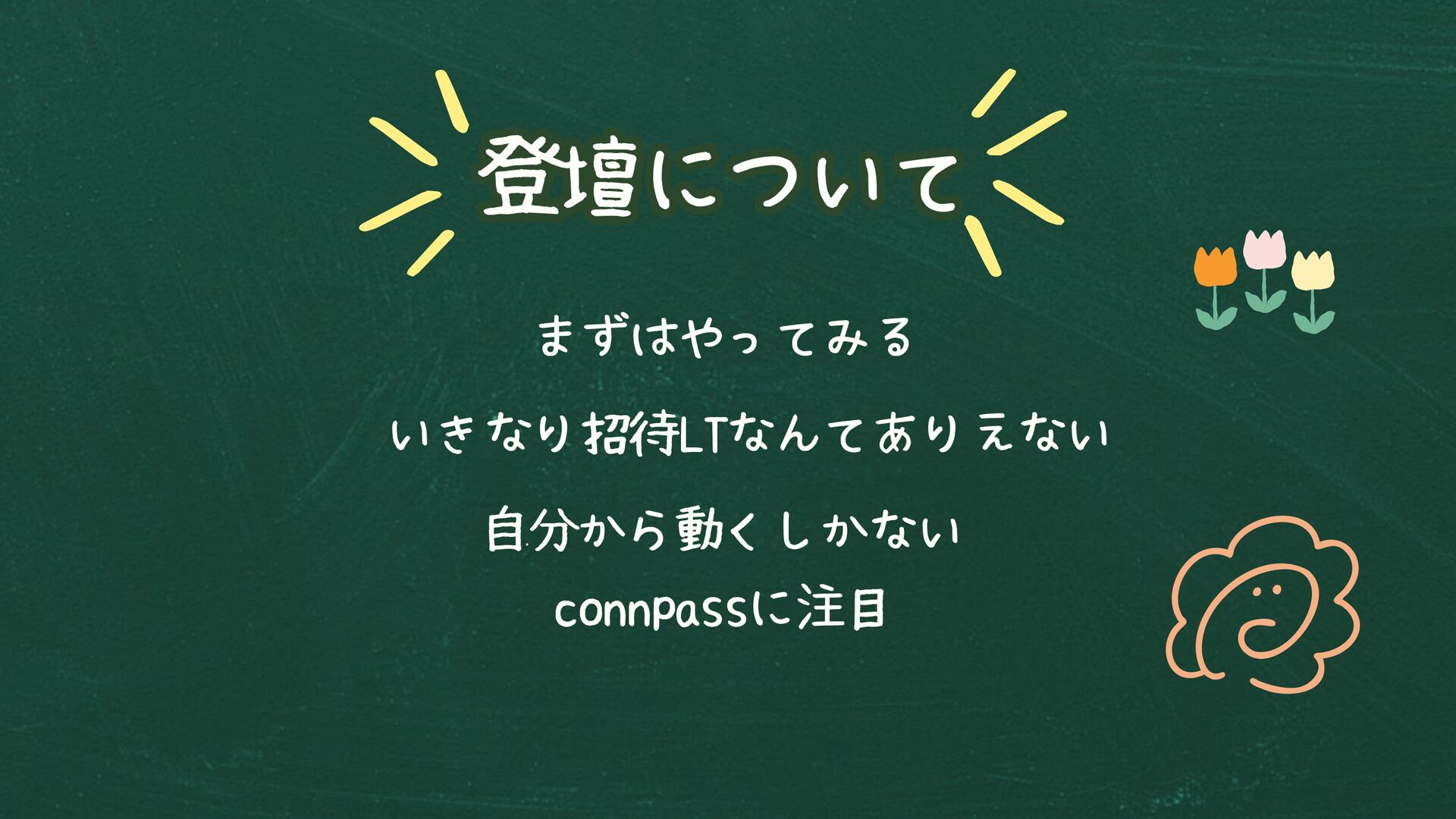 まずはやってみる 登壇について 登壇について 登壇について いきなり招待LTなんてありえない 自分から動くしかない connpassに注目