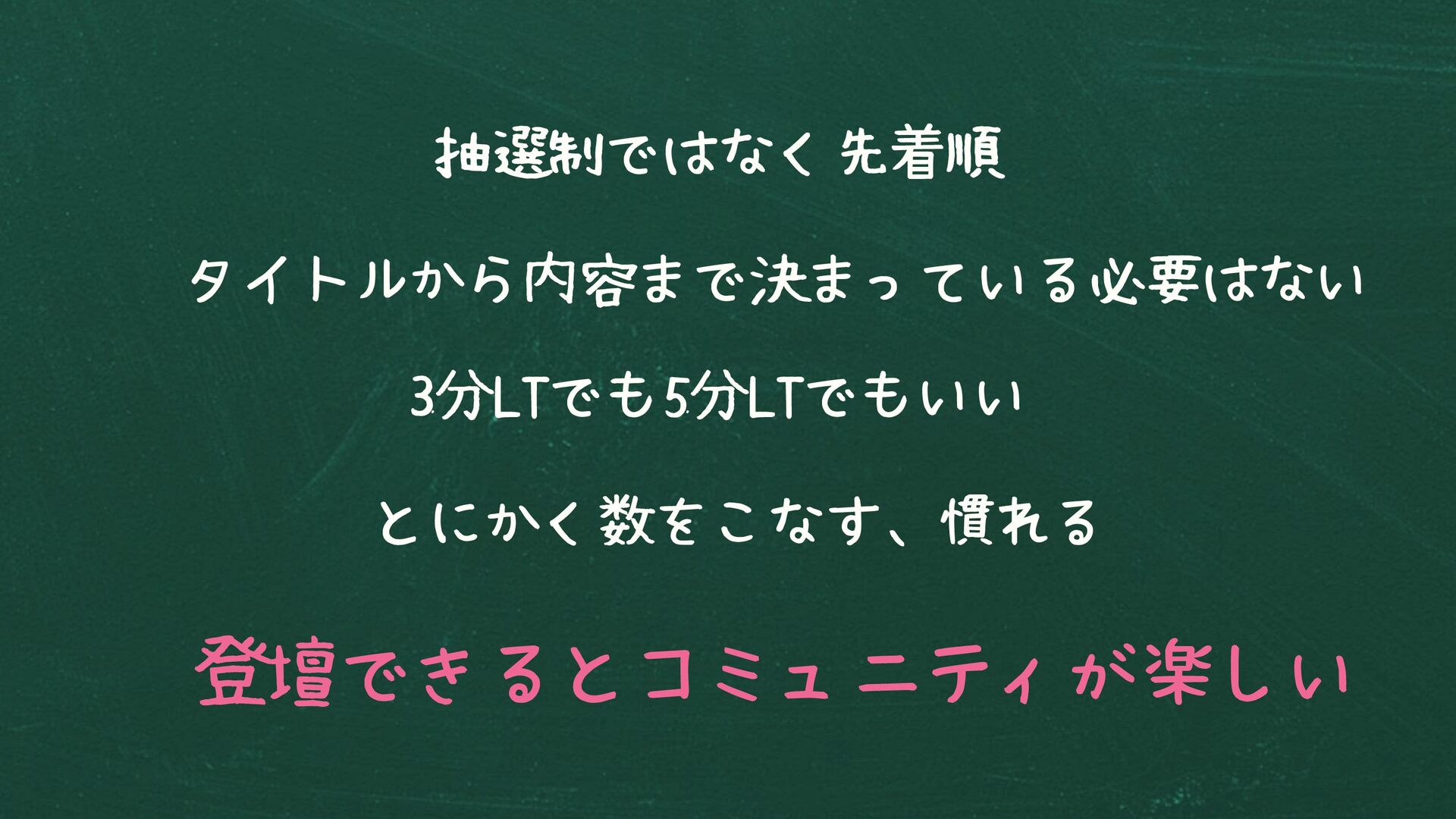 抽選制ではなく先着順 タイトルから内容まで決まっている必要はない 3分LTでも5分LTでもいい とにかく数をこなす、慣れる 登壇できるとコミュニティが楽しい