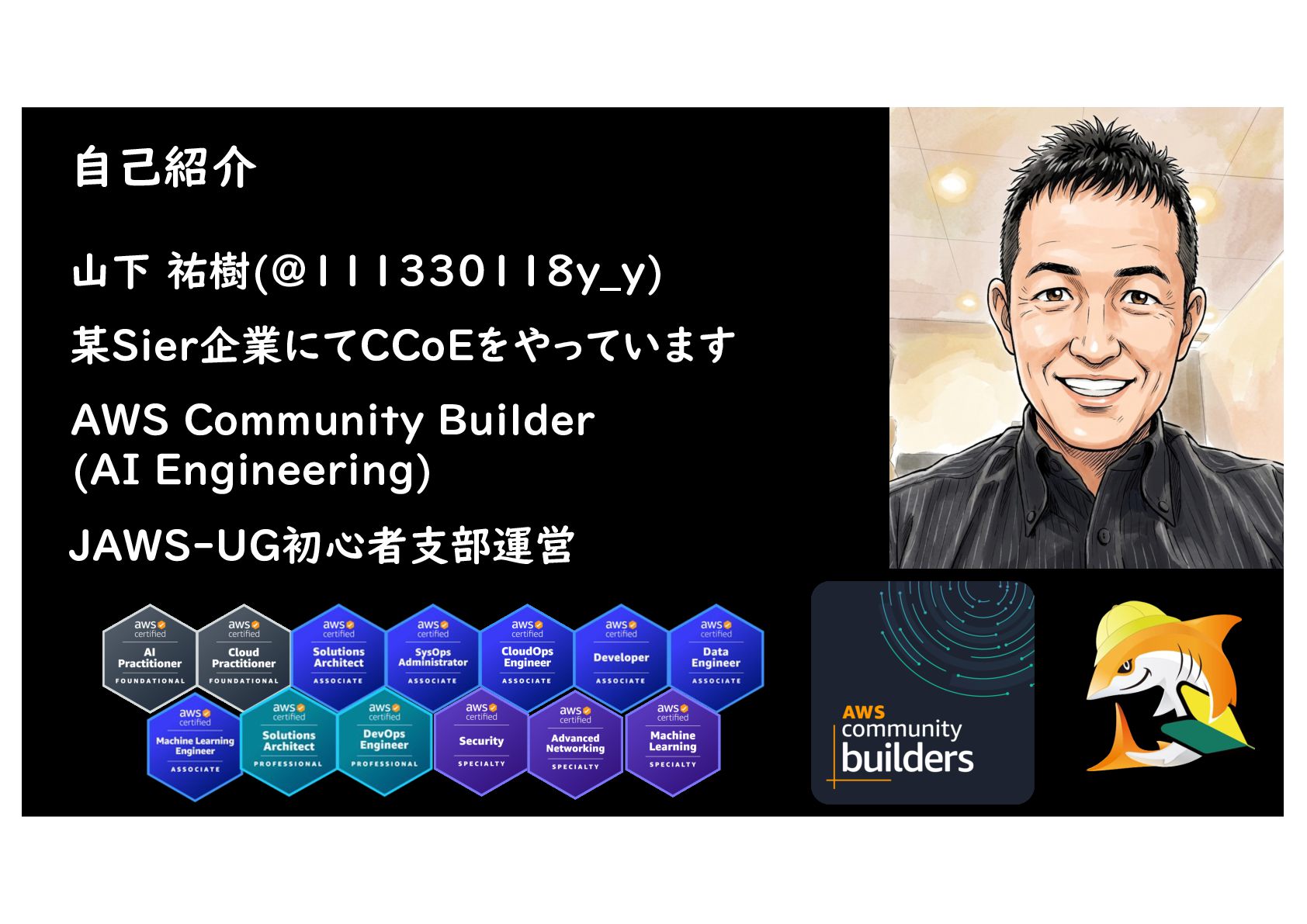 山下 祐樹(@111330118y_y) 某Sier企業にてCCoEをやっています AWS Community Builder (AI Engineering) JAWS-UG初心者支部運営 自己紹介
