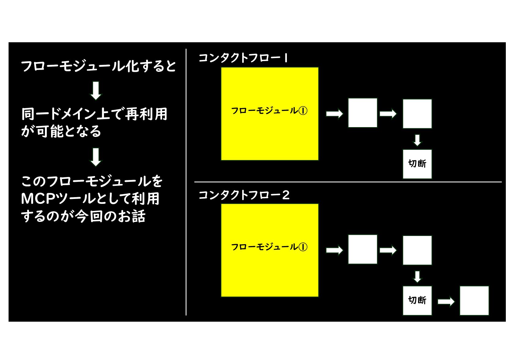 フローモジュール① 切断 フローモジュール① 切断 コンタクトフロー1 コンタクトフロー2 フローモジュール化すると 同一ドメイン上で再利用 が可能となる このフローモジュールを