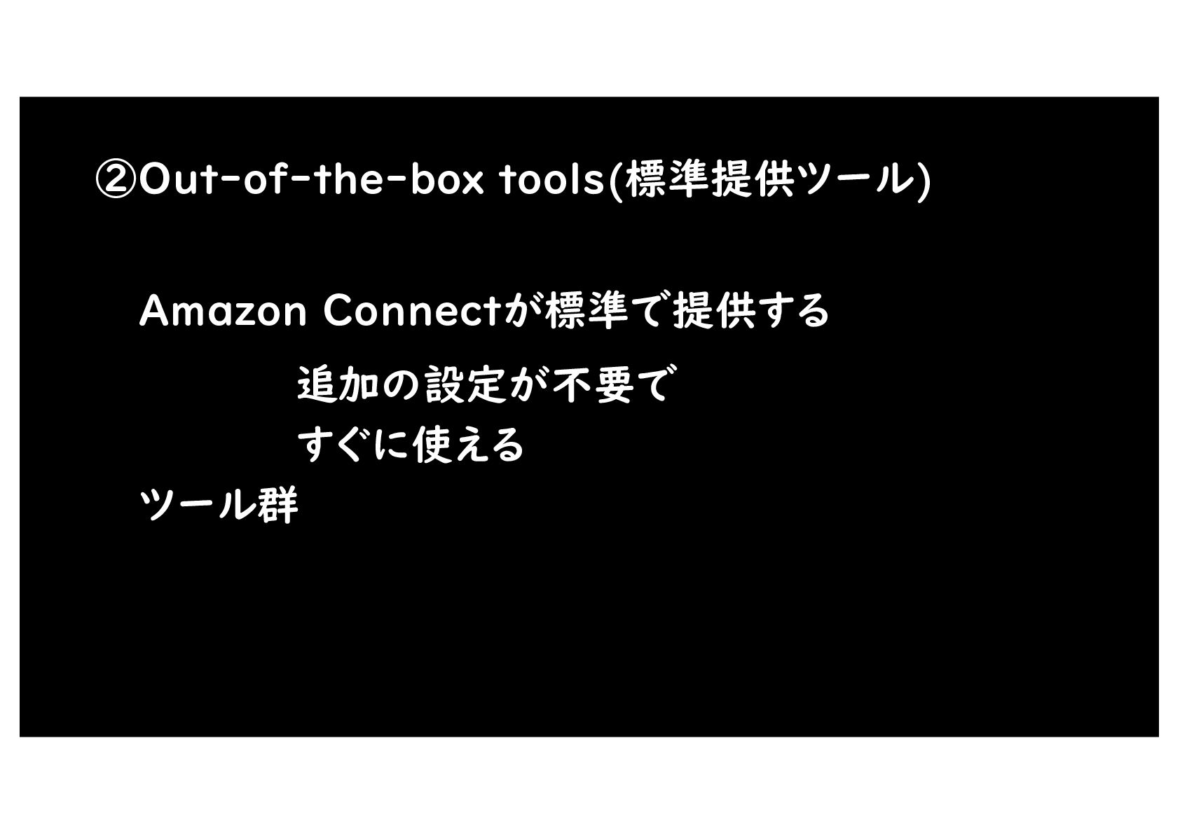 ②Out-of-the-box tools(標準提供ツール) Amazon Connectが標準で提供する ツール群 追加の設定が不要で すぐに使える