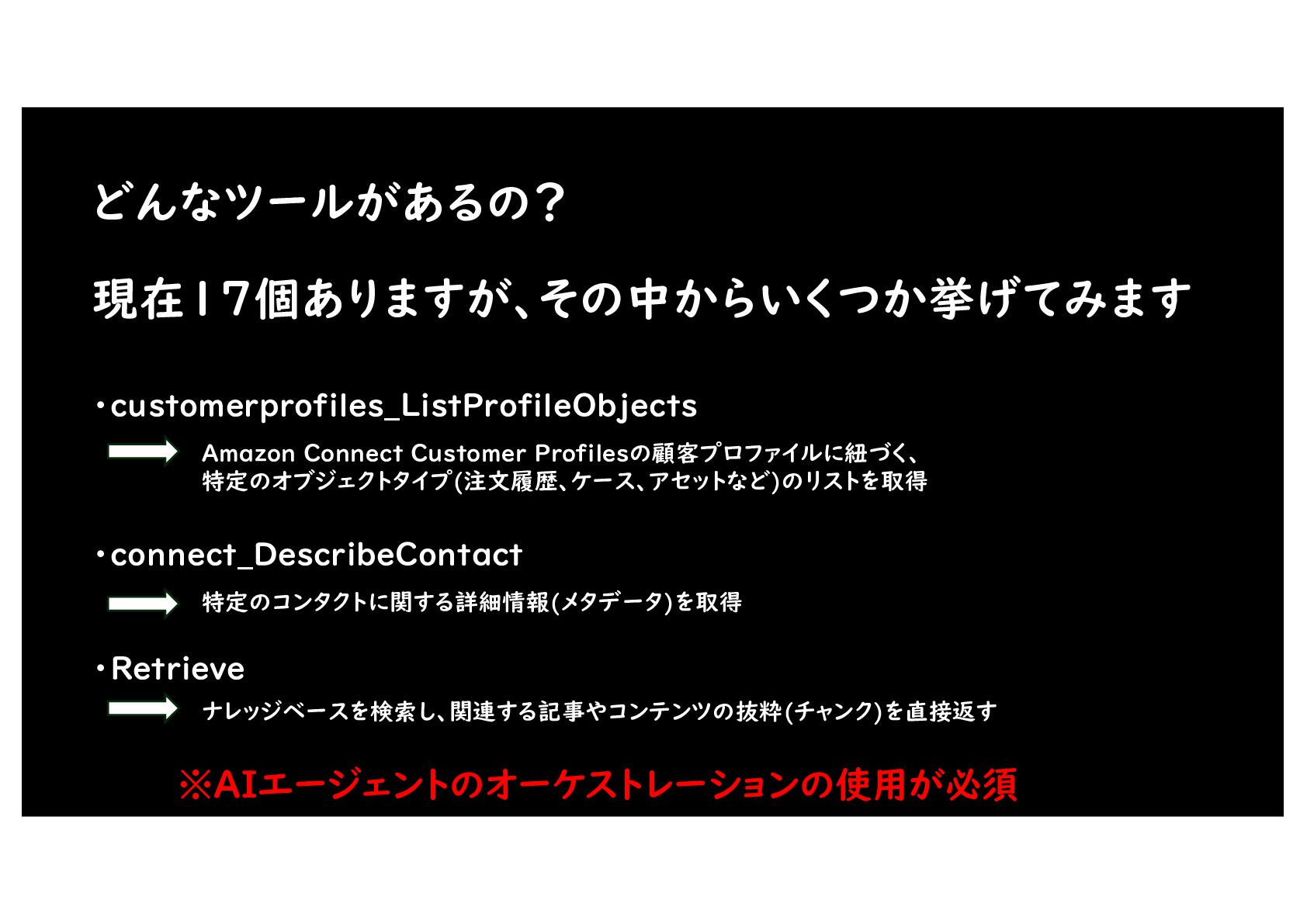 どんなツールがあるの? 現在17個ありますが、その中からいくつか挙げてみます ・customerprofiles_ListProfileObjects Amazon Connect Customer Profilesの顧客プロファイルに紐づく、 特定のオブジェクトタイプ(注文履歴、ケース、アセットなど)のリストを取得 ・connect_DescribeContact 特定のコンタクトに関する詳細情報(メタデータ)を取得