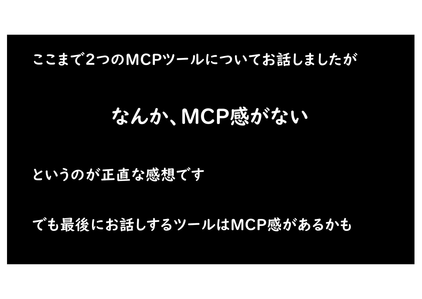 ここまで2つのMCPツールについてお話しましたが なんか、MCP感がない というのが正直な感想です でも最後にお話しするツールはMCP感があるかも