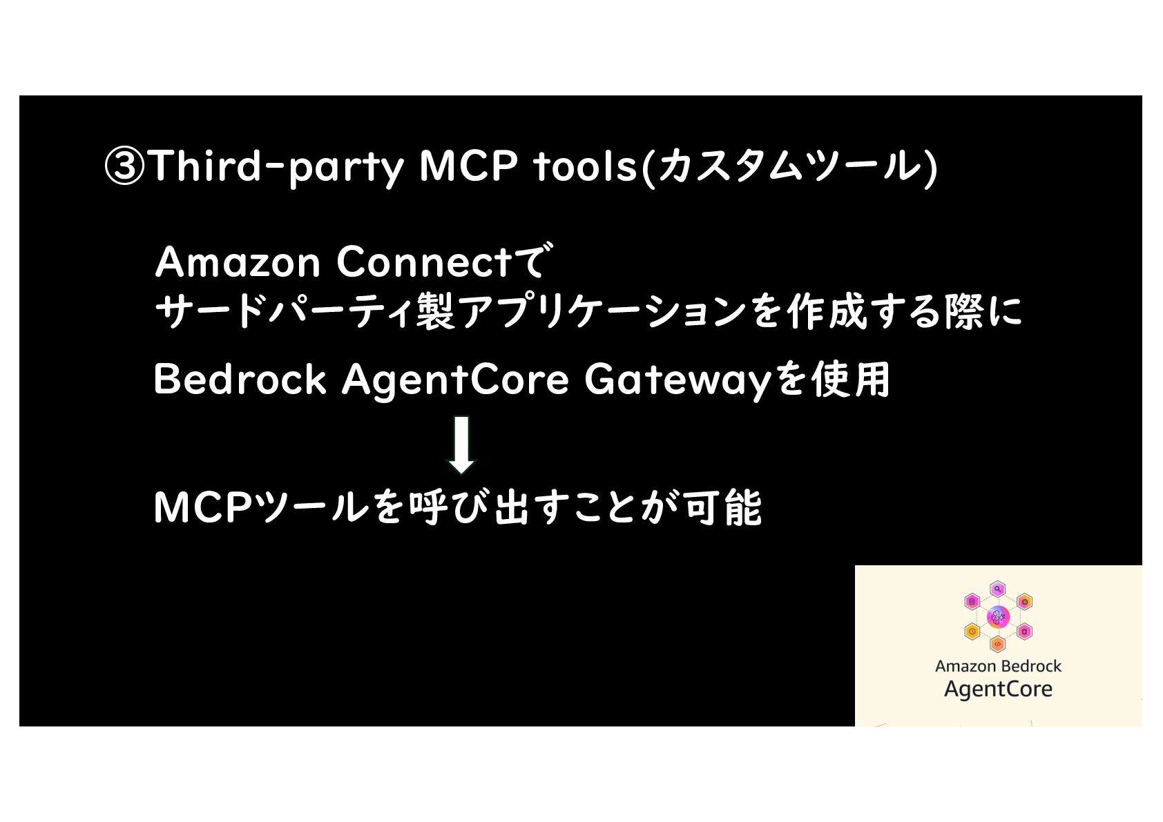 ③Third-party MCP tools(カスタムツール) Bedrock AgentCore Gatewayを使用 Amazon Connectで サードパーティ製アプリケーションを作成する際に MCPツールを呼び出すことが可能