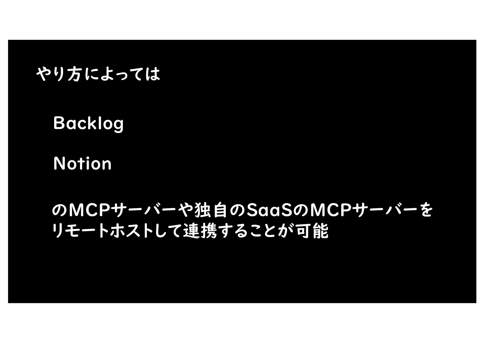やり方によっては Backlog Notion のMCPサーバーや独自のSaaSのMCPサーバーを リモートホストして連携することが可能