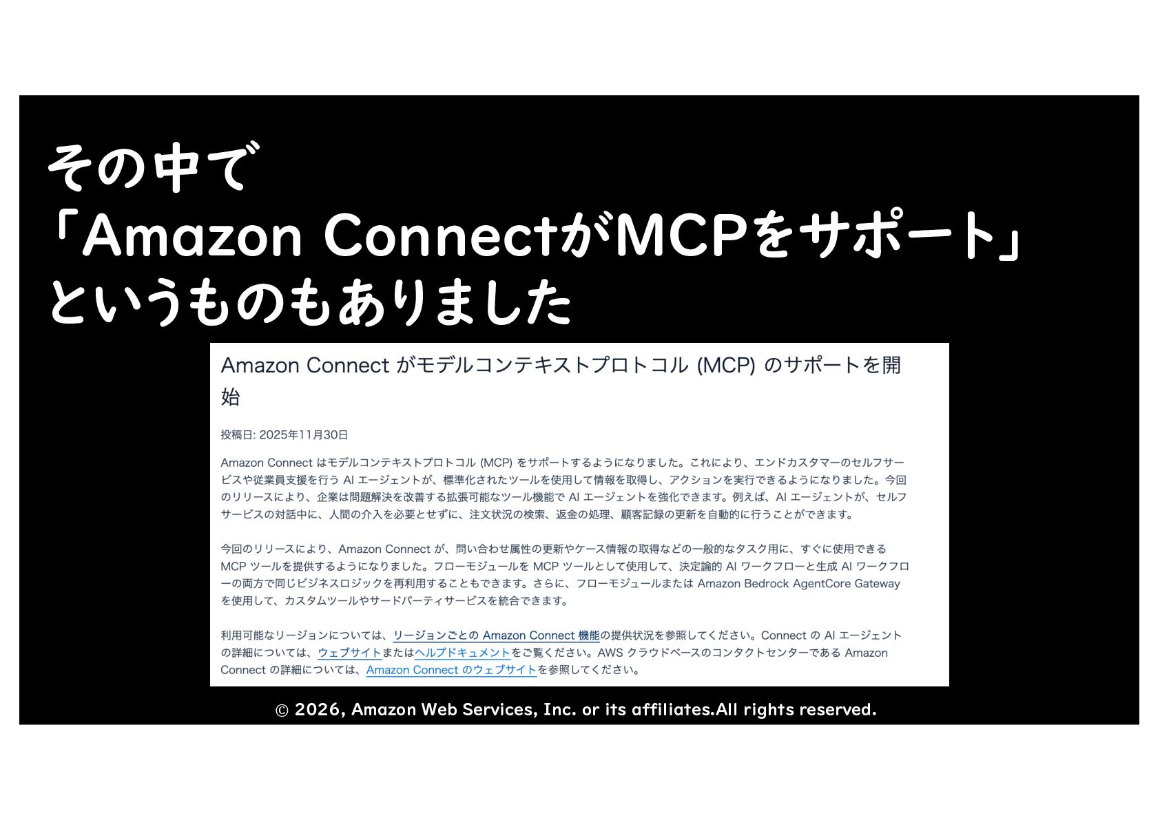 その中で 「Amazon ConnectがMCPをサポート」 というものもありました © 2026, Amazon Web Services, Inc.