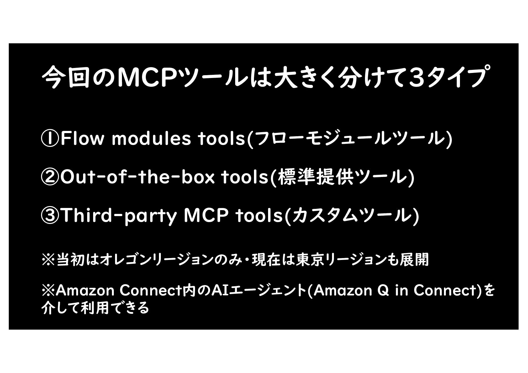 今回のMCPツールは大きく分けて3タイプ ②Out-of-the-box tools(標準提供ツール) ①Flow modules tools(フローモジュールツール) ③Third-party MCP tools(カスタムツール) ※当初はオレゴンリージョンのみ・現在は東京リージョンも展開