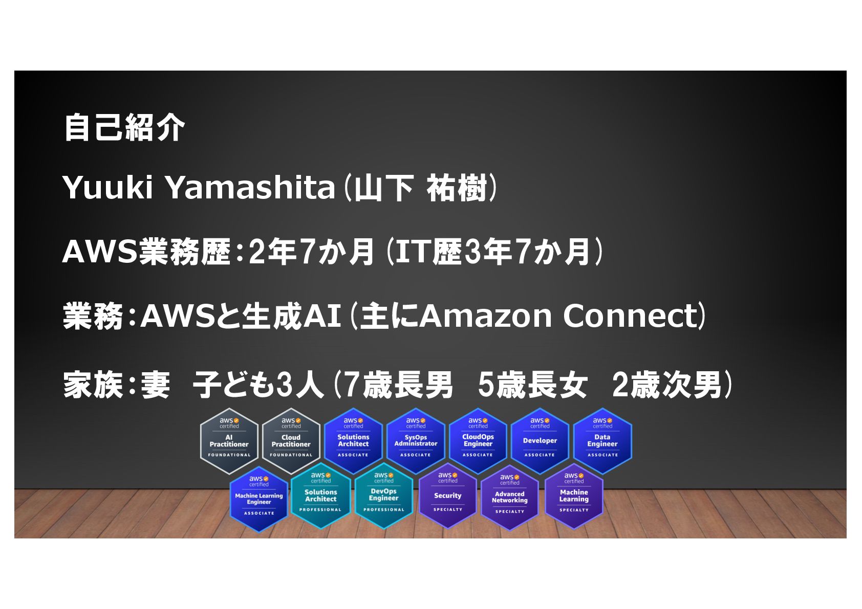 自己紹介 Yuuki Yamashita(山下 祐樹) AWS業務歴:2年7か月(IT歴3年7か月) 業務:AWSと生成AI(主にAmazon Connect) 家族:妻 子ども3人(7歳長男 5歳長女