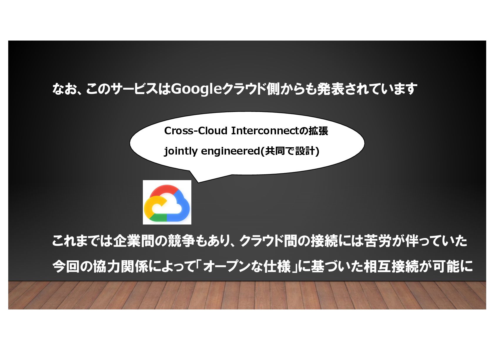 なお、このサービスはGoogleクラウド側からも発表されています Cross-Cloud Interconnectの拡張 jointly engineered(共同で設計) これまでは企業間の競争もあり、クラウド間の接続には苦労が伴っていた 今回の協力関係によって「オープンな仕様」に基づいた相互接続が可能に