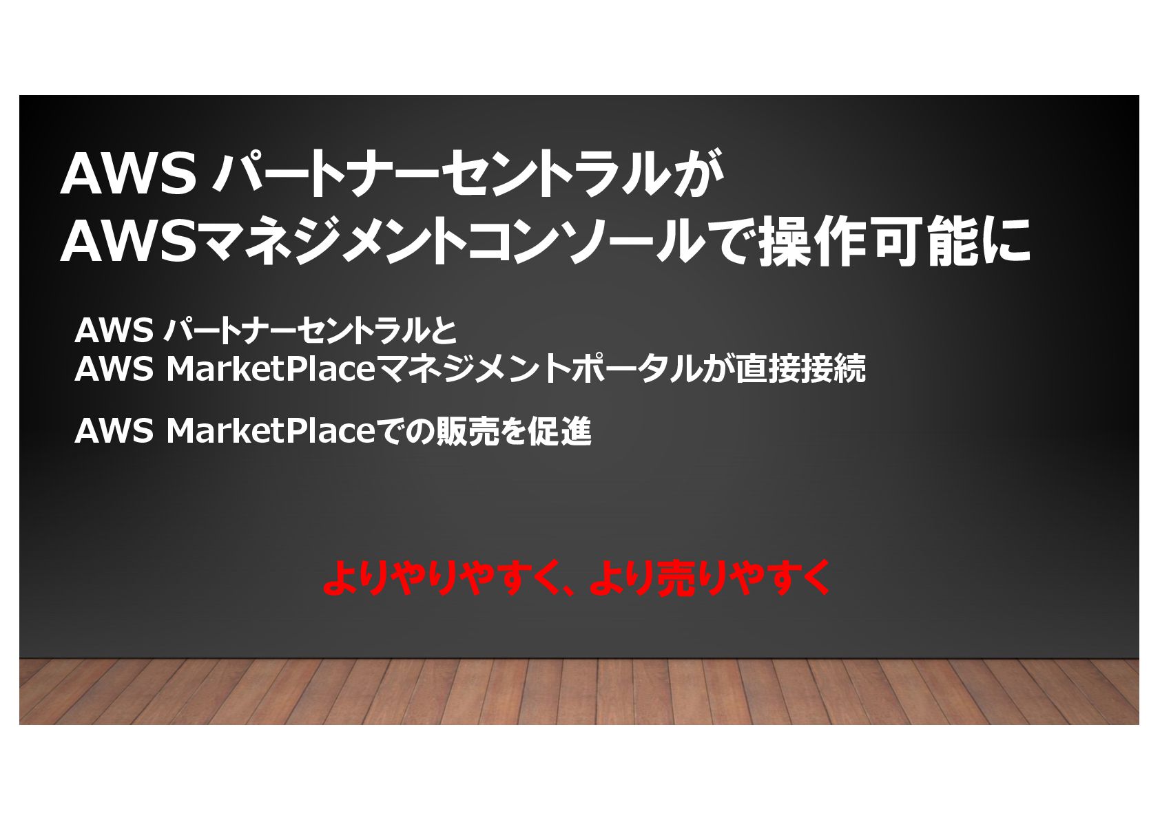 AWS パートナーセントラルが AWSマネジメントコンソールで操作可能に AWS MarketPlaceでの販売を促進 AWS パートナーセントラルと AWS MarketPlaceマネジメントポータルが直接接続 よりやりやすく、より売りやすく