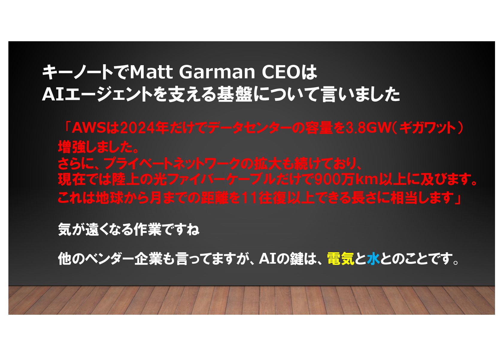 キーノートでMatt Garman CEOは AIエージェントを支える基盤について言いました 「AWSは2024年だけでデータセンターの容量を3.8GW(ギガワット) 増強しました。 さらに、プライベートネットワークの拡大も続けており、 現在では陸上の光ファイバーケーブルだけで900万km以上に及びます。 これは地球から月までの距離を11往復以上できる長さに相当します」 気が遠くなる作業ですね