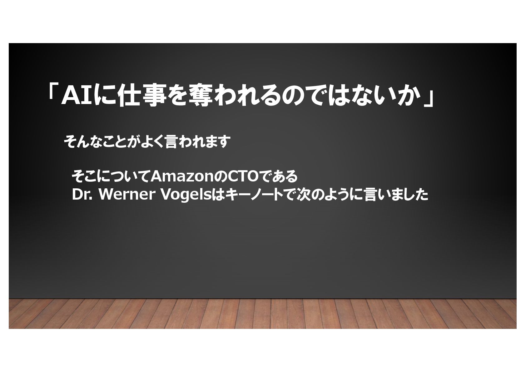 「AIに仕事を奪われるのではないか」 そんなことがよく言われます そこについてAmazonのCTOである Dr. Werner Vogelsはキーノートで次のように言いました