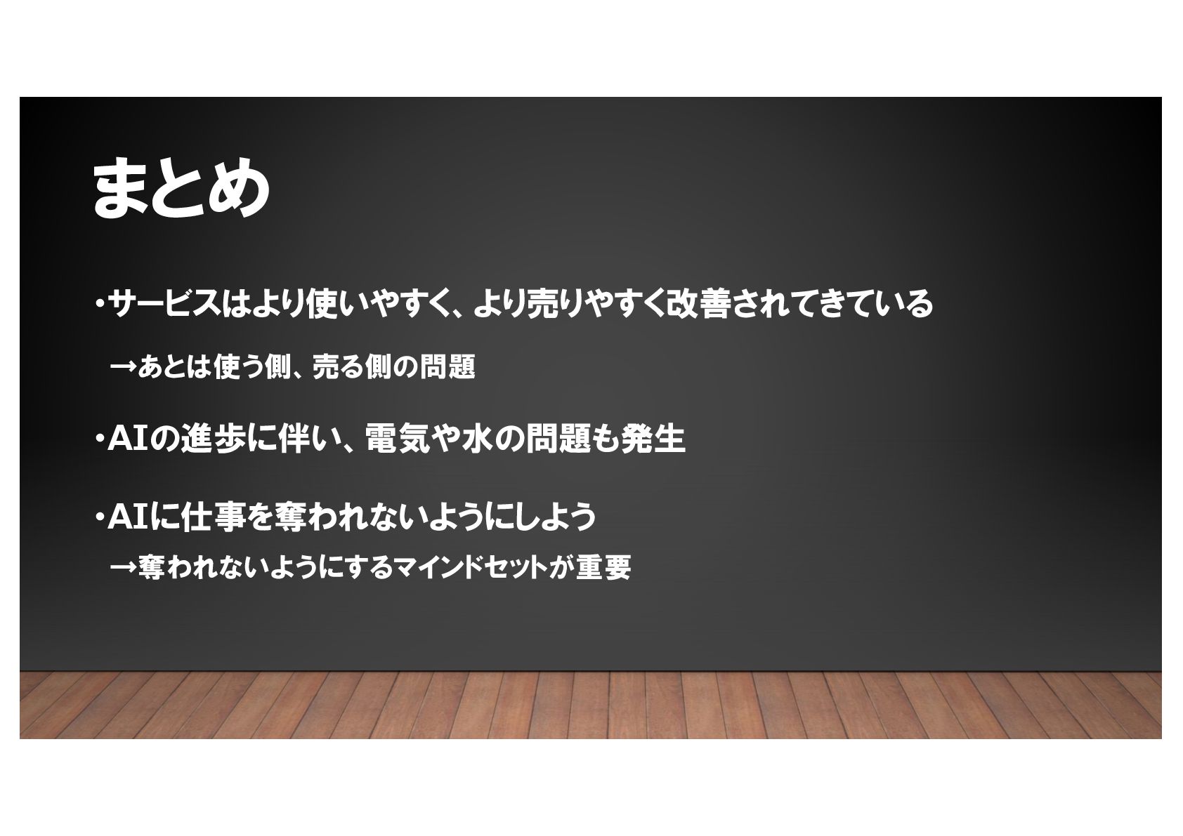 まとめ ・サービスはより使いやすく、より売りやすく改善されてきている →あとは使う側、売る側の問題 ・AIの進歩に伴い、電気や水の問題も発生 →奪われないようにするマインドセットが重要 ・AIに仕事を奪われないようにしよう