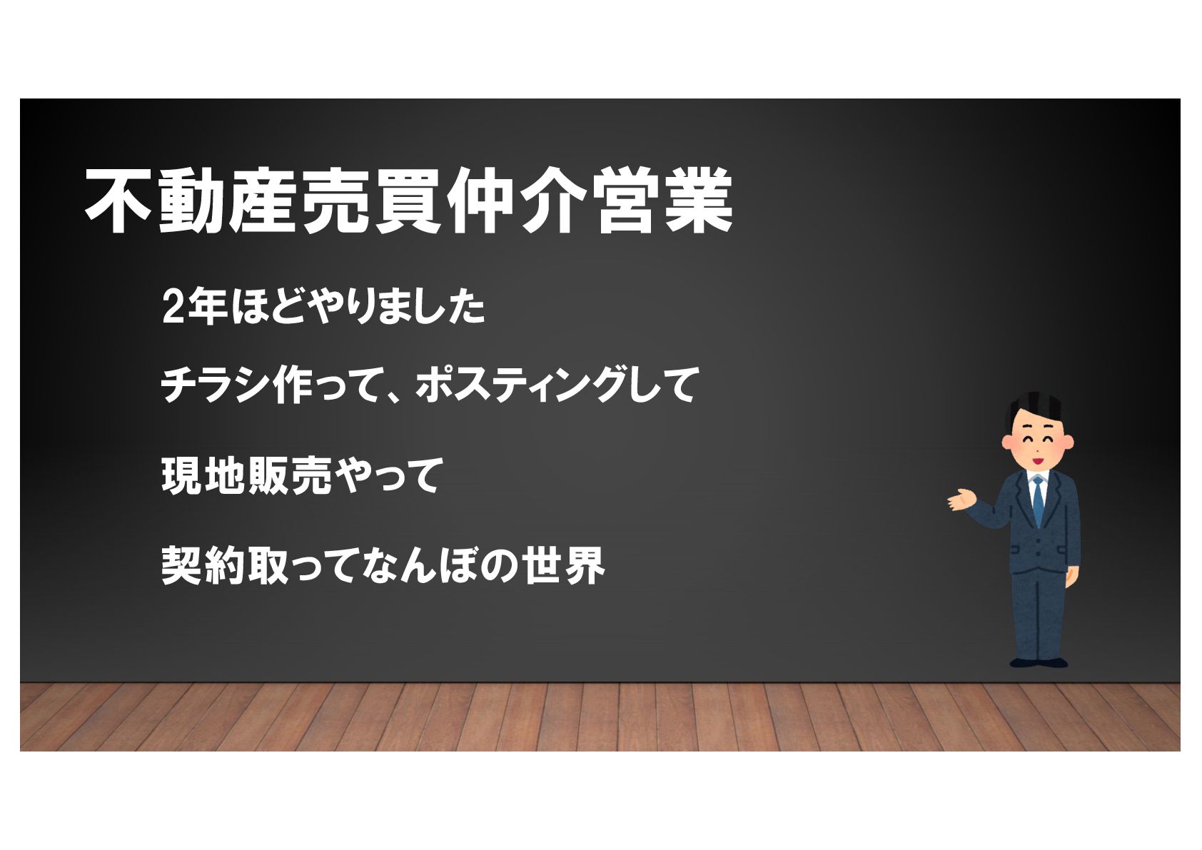 不動産売買仲介営業 2年ほどやりました チラシ作って、ポスティングして 現地販売やって 契約取ってなんぼの世界