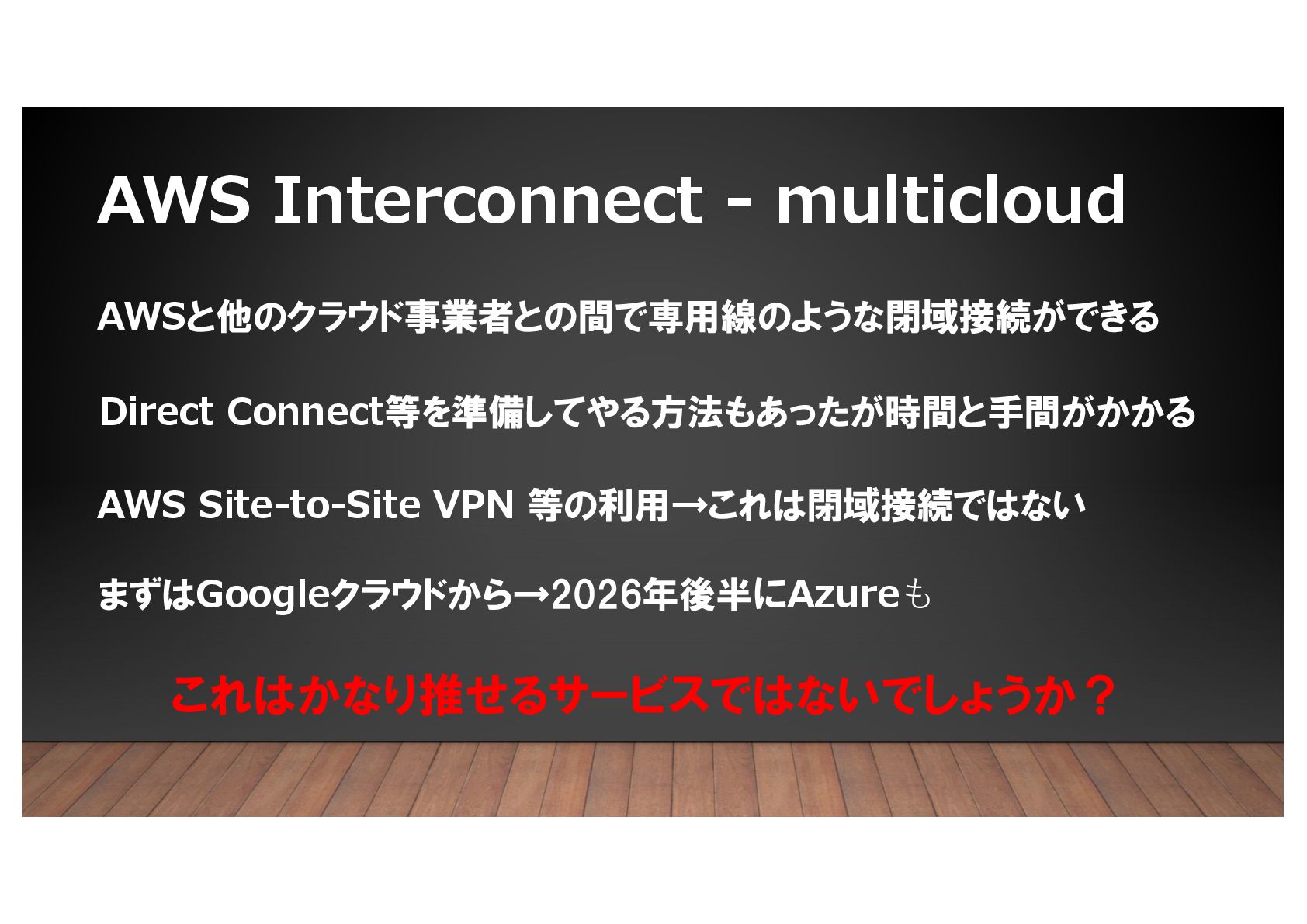 AWS Interconnect - multicloud AWSと他のクラウド事業者との間で専用線のような閉域接続ができる Direct Connect等を準備してやる方法もあったが時間と手間がかかる AWS Site-to-Site VPN