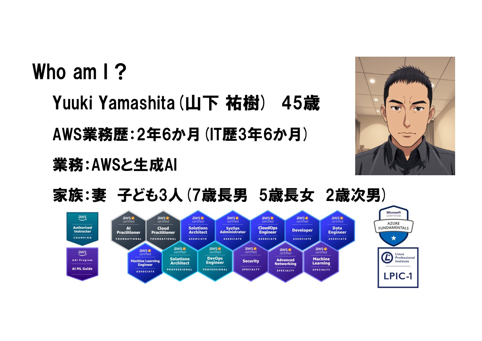 Who am I ? Yuuki Yamashita(山下 祐樹) 45歳 AWS業務歴:2年6か月(IT歴3年6か月) 業務:AWSと生成AI