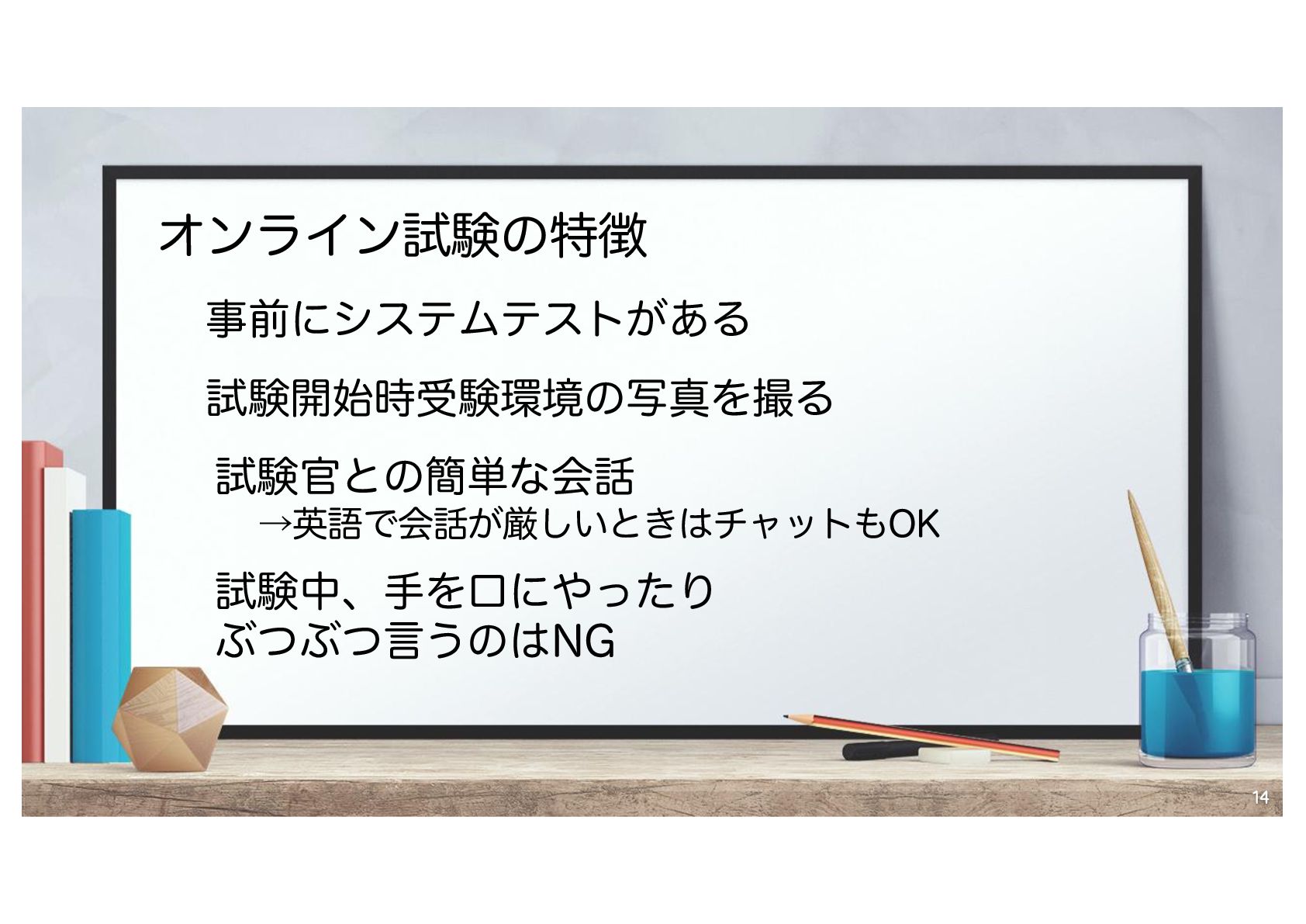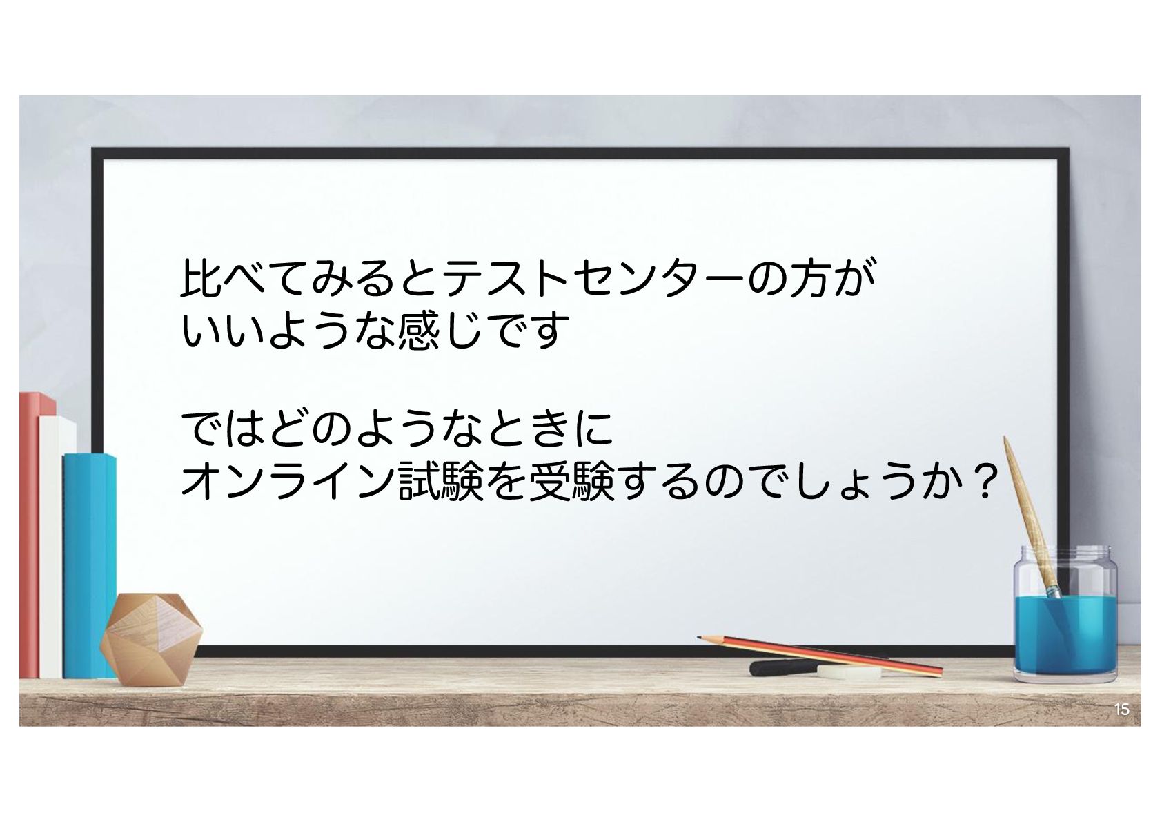 14 ΦϯϥΠϯࢼݧͷಛ ࣄલʹγεςϜςετ͕͋Δ ࢼݧ։࢝࣌डݧڥͷࣸਅΛࡱΔ ࢼݧͱͷ؆୯ͳձ ˠӳޠͰձ͕ݫ͍͠ͱ͖νϟοτ0, ࢼݧதɺखΛޱʹͬͨΓ ͿͭͿͭݴ͏ͷ/(