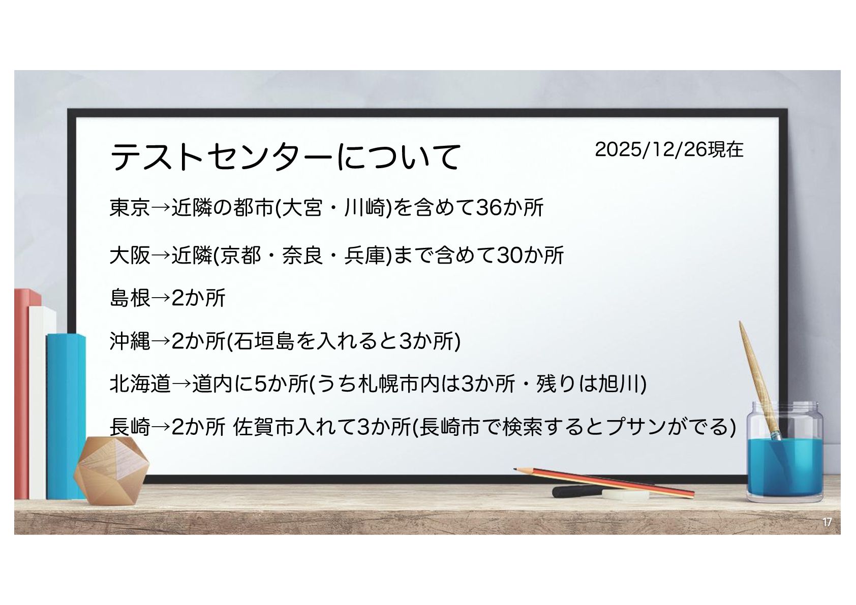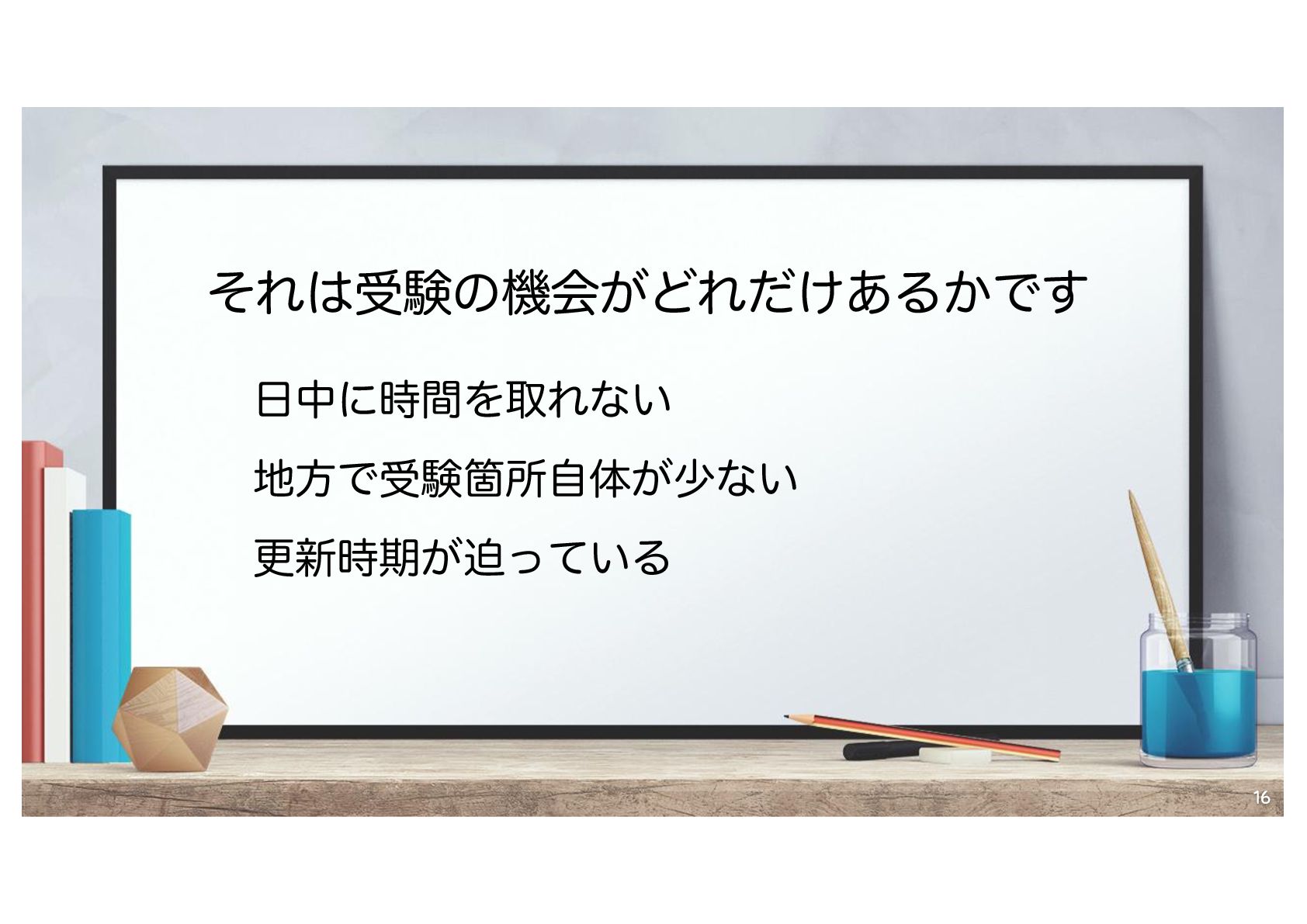 16 ͦΕडݧͷػձ͕ͲΕ͚ͩ͋Δ͔Ͱ͢ தʹ࣌ؒΛऔΕͳ͍ ํͰडݧՕॴࣗମ͕গͳ͍ ߋ৽࣌ظ͕ഭ͍ͬͯΔ
