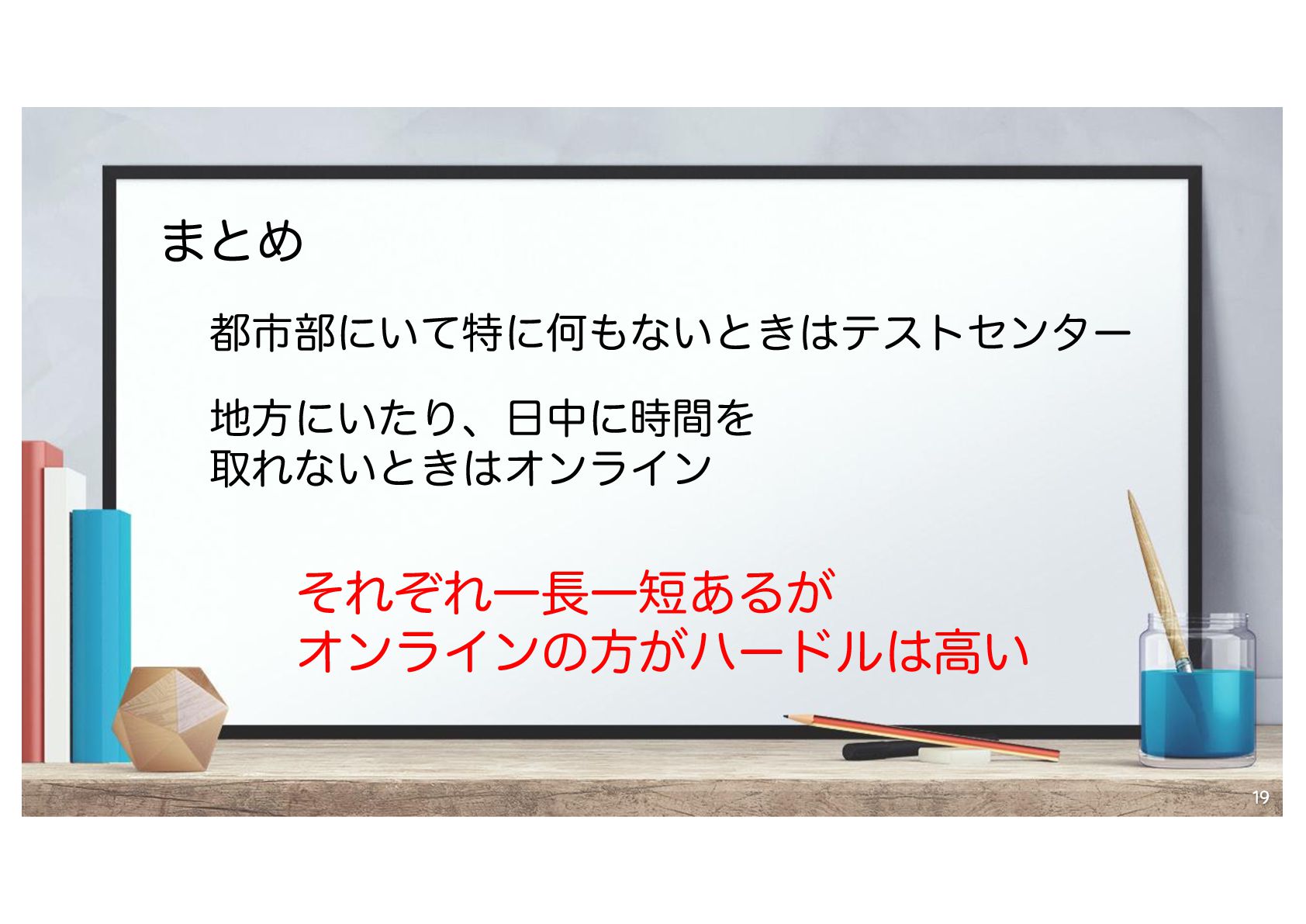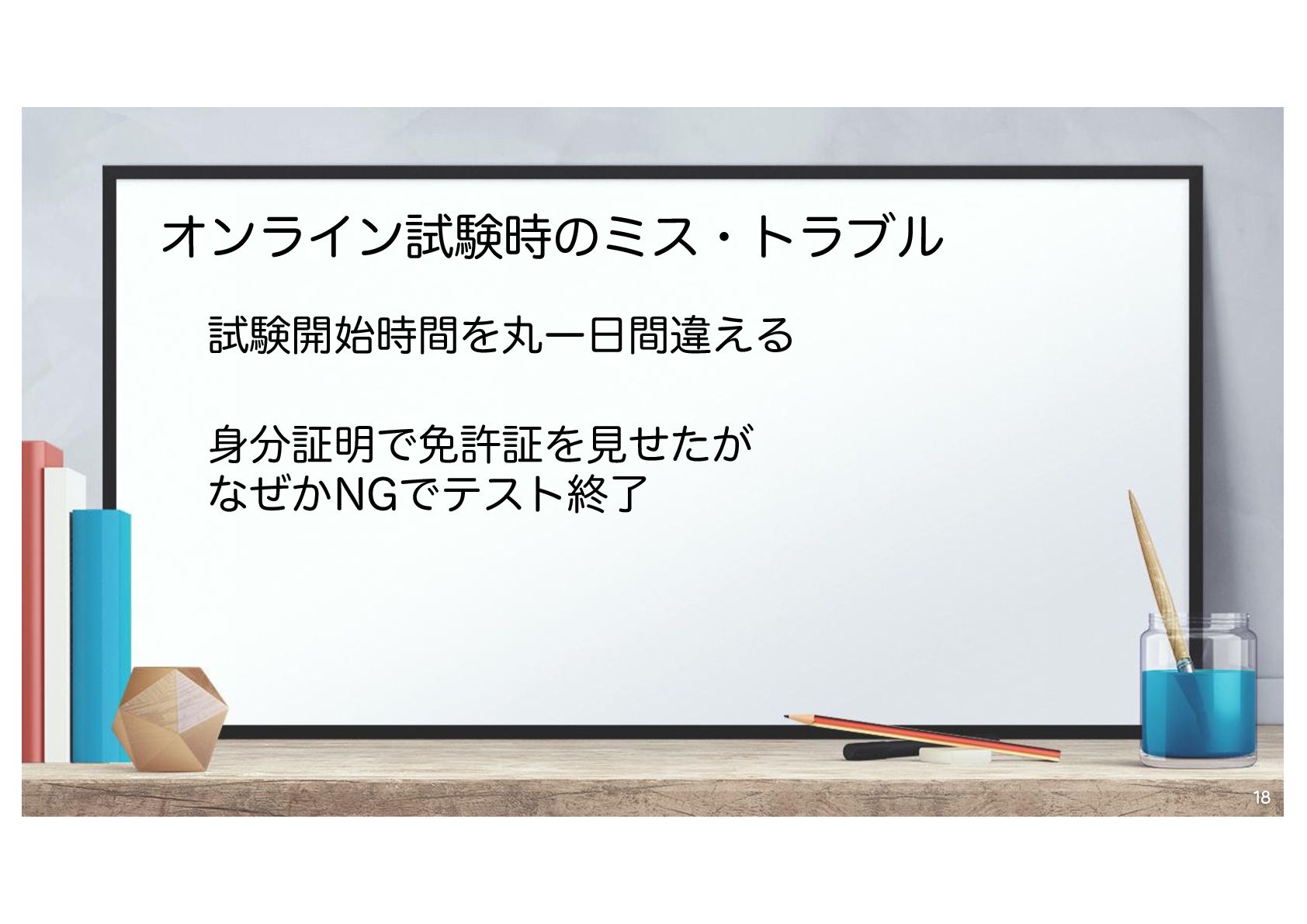 18 ΦϯϥΠϯࢼݧ࣌ͷϛεɾτϥϒϧ ࢼݧ։࢝࣌ؒΛؙҰؒҧ͑Δ ূ໌Ͱ໔ڐূΛݟ͕ͤͨ ͳ͔ͥ/(Ͱςετऴྃ