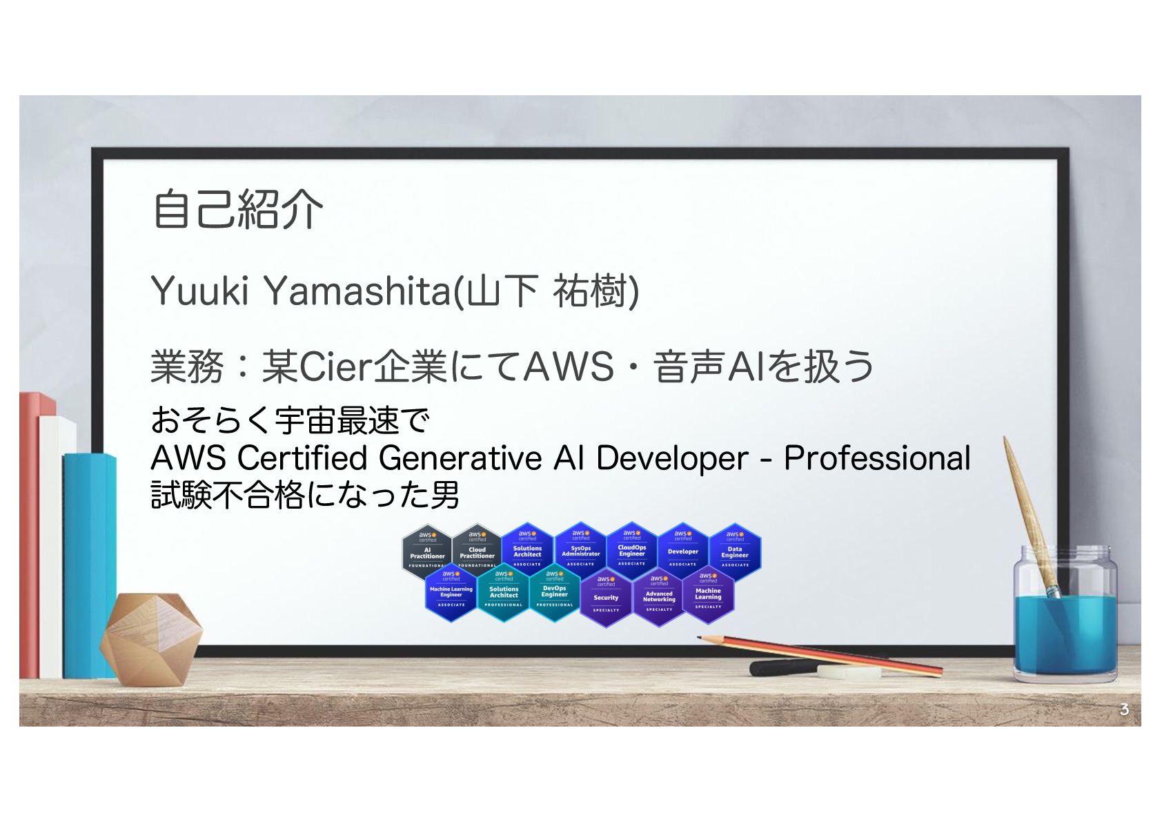3 ࣗݾհ :VVLJ:BNBTIJUB ࢁԼ༞थ ۀɿ$JFSاۀʹͯ"84ɾԻ"*Λѻ͏ ͓ͦΒ͘Ӊ࠷Ͱ "84$FSUJGJFE(FOFSBUJWF"*%FWFMPQFS1SPGFTTJPOBM ࢼݧෆ߹֨ʹͳͬͨஉ