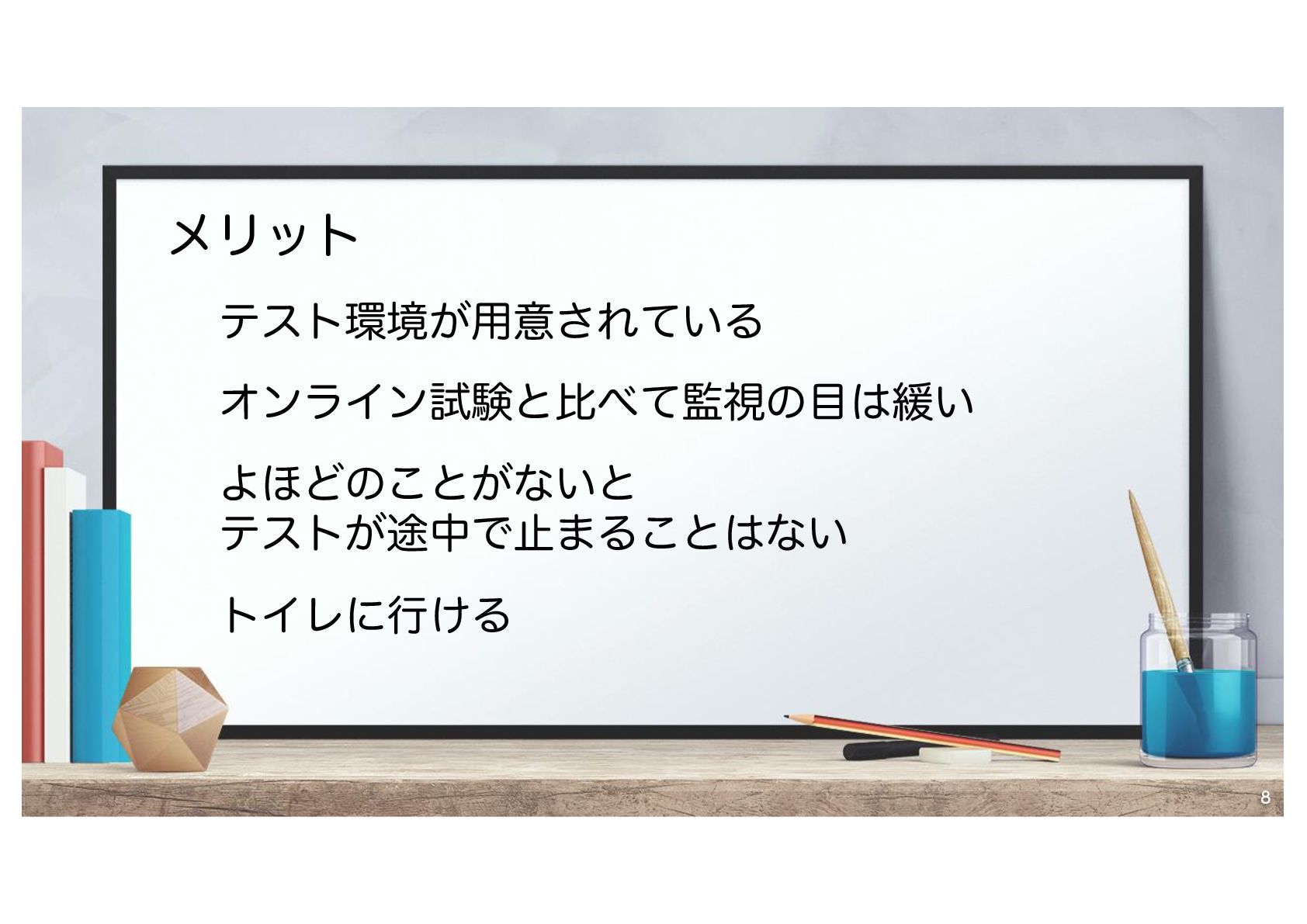 8 ϝϦοτ ςετڥ͕༻ҙ͞Ε͍ͯΔ ΦϯϥΠϯࢼݧͱൺͯࢹͷ؇͍ Α΄Ͳͷ͜ͱ͕ͳ͍ͱ ςετ్͕தͰࢭ·Δ͜ͱͳ͍ τΠϨʹߦ͚Δ