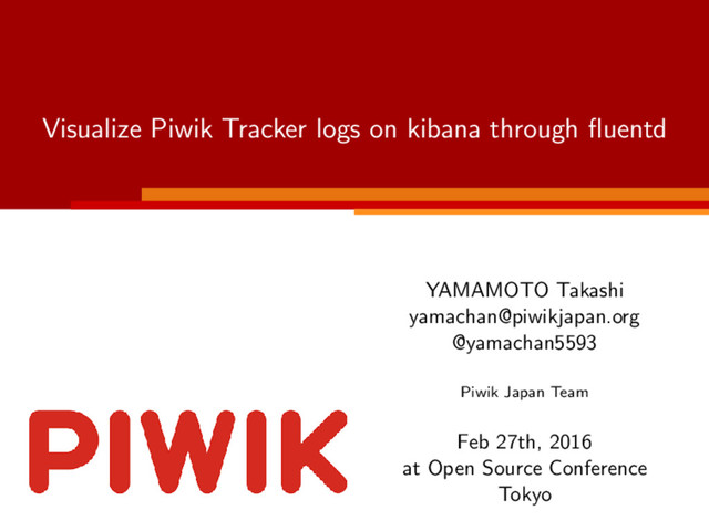 default. □ When I confirmed the other way under the RedHat 6, I wrote (RedHat6). □ (RedHat6)· · · CentOS6, Scientific Linux 6 ▪ Assume that the Piwik already working on your server. □ Please see the link to install the Piwik2. ▪ We will install fluentd, elasticsearch and kibana have installed on the same server. □ I’ll explain that Piwik and other softwares have installed on same server (living together), and Piwik has installed separately from other softwares (living apart). 2http://piwik.org/docs/installation 8 of 47