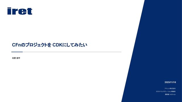 北野 涼平 CFnのプロジェクトを CDKにしてみたい 2023/11/16 アイレット株式会社 クラウドインテグレーション事業部 開発第1セクション