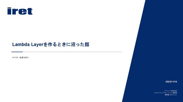 ヤマダ(北野 涼平) Lambda Layerを作るときに沼った話 2023/11/16 アイレット株式会社 クラウドインテグレーション事業部 開発第1セクション