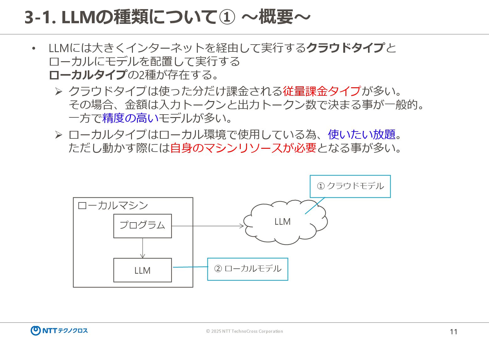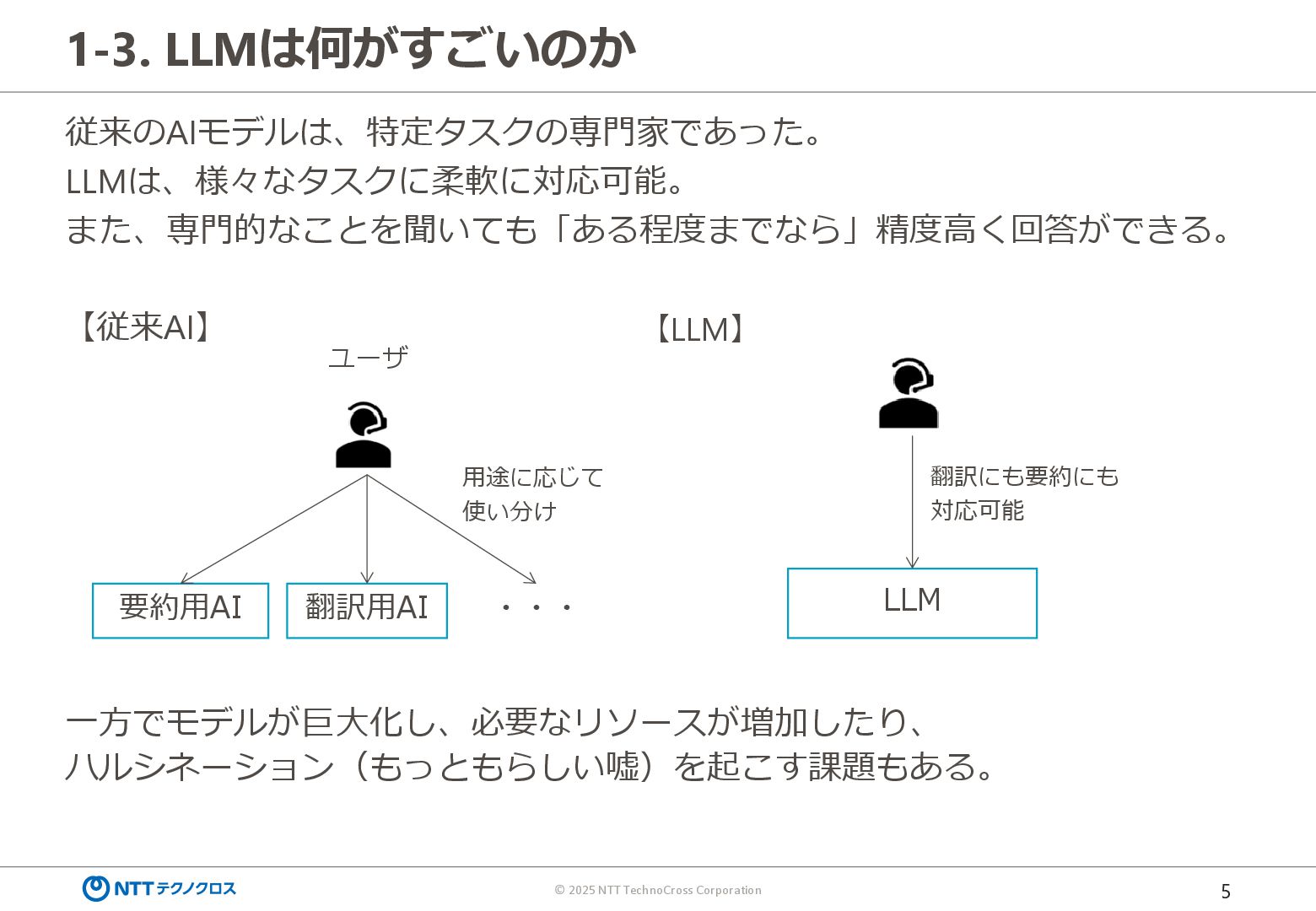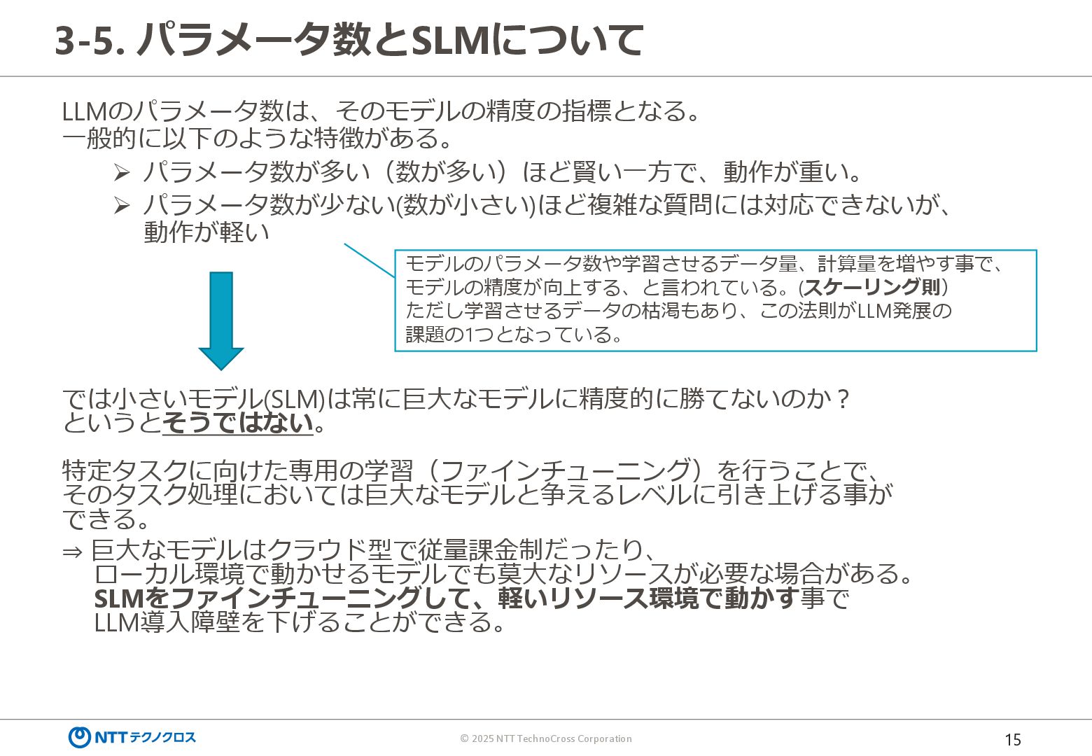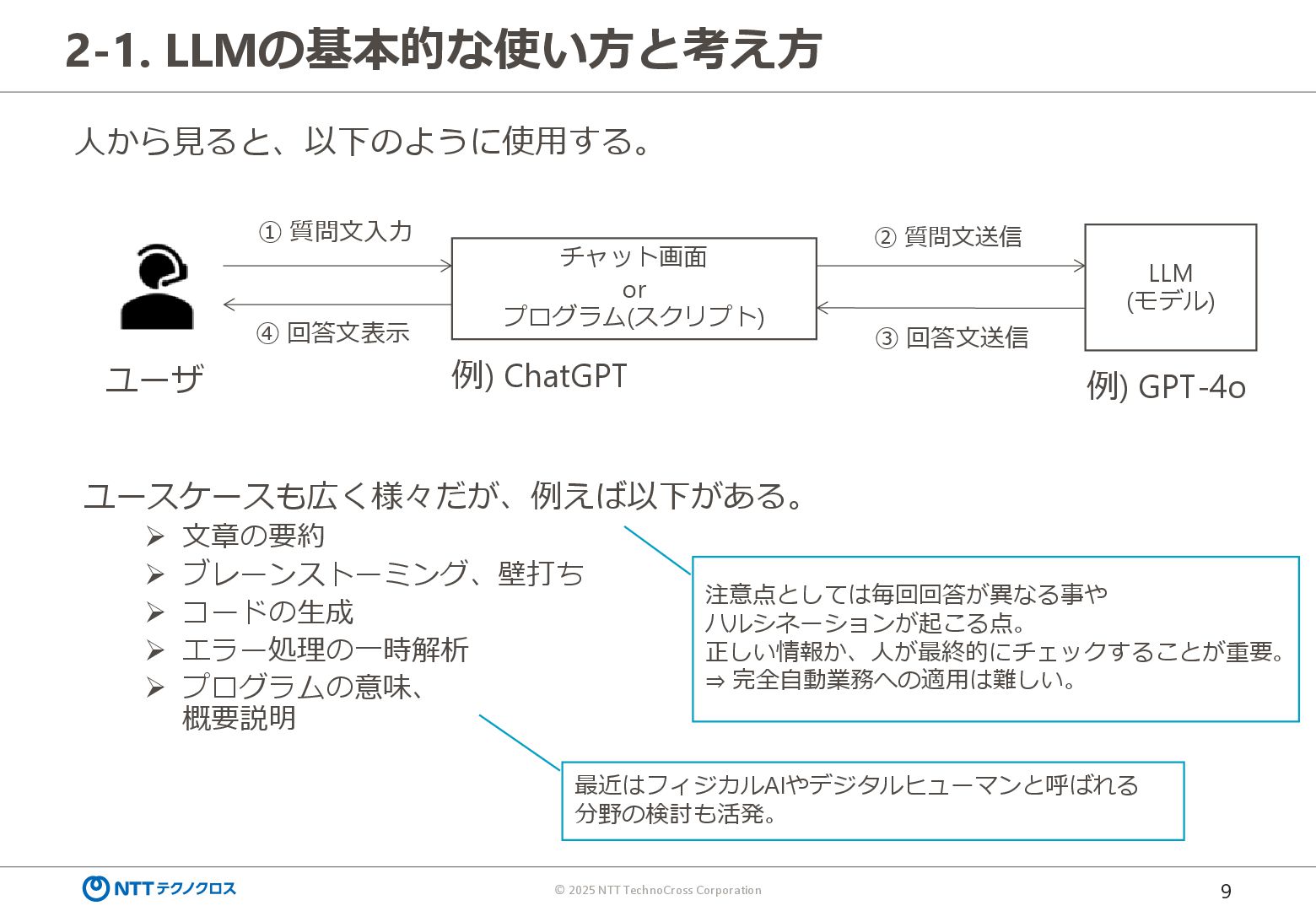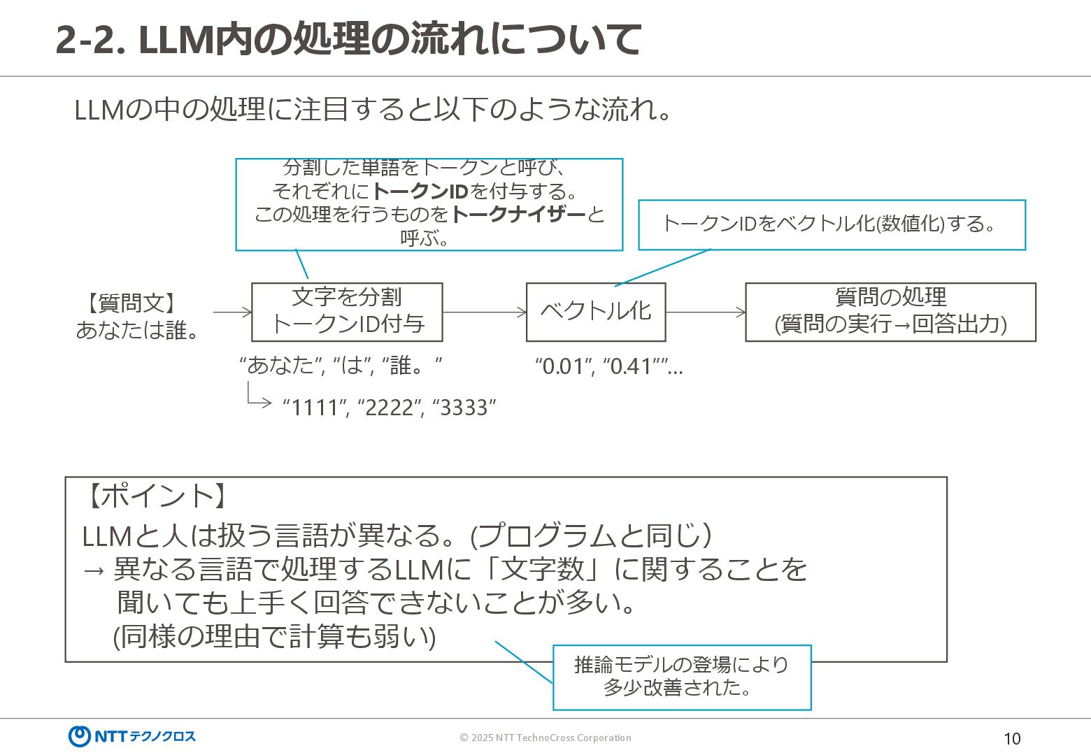 → 異なる言語で処理するLLMに「文字数」に関することを 聞いても上手く回答できないことが多い。 (同様の理由で計算も弱い) LLMの中の処理に注目すると以下のような流れ。 文字を分割 トークンID付与 ベクトル化 質問の処理 (質問の実行→回答出力) 【質問文】 あなたは誰。 “あなた”, “は”, “誰。” “0.01”, “0.41””… 分割した単語をトークンと呼び、 それぞれにトークンIDを付与する。 この処理を行うものをトークナイザーと 呼ぶ。 トークンIDをベクトル化(数値化)する。 “1111”, “2222”, “3333” 推論モデルの登場により 多少改善された。
