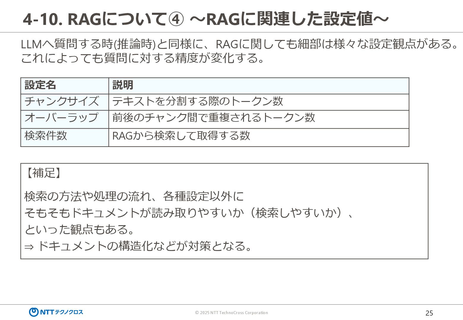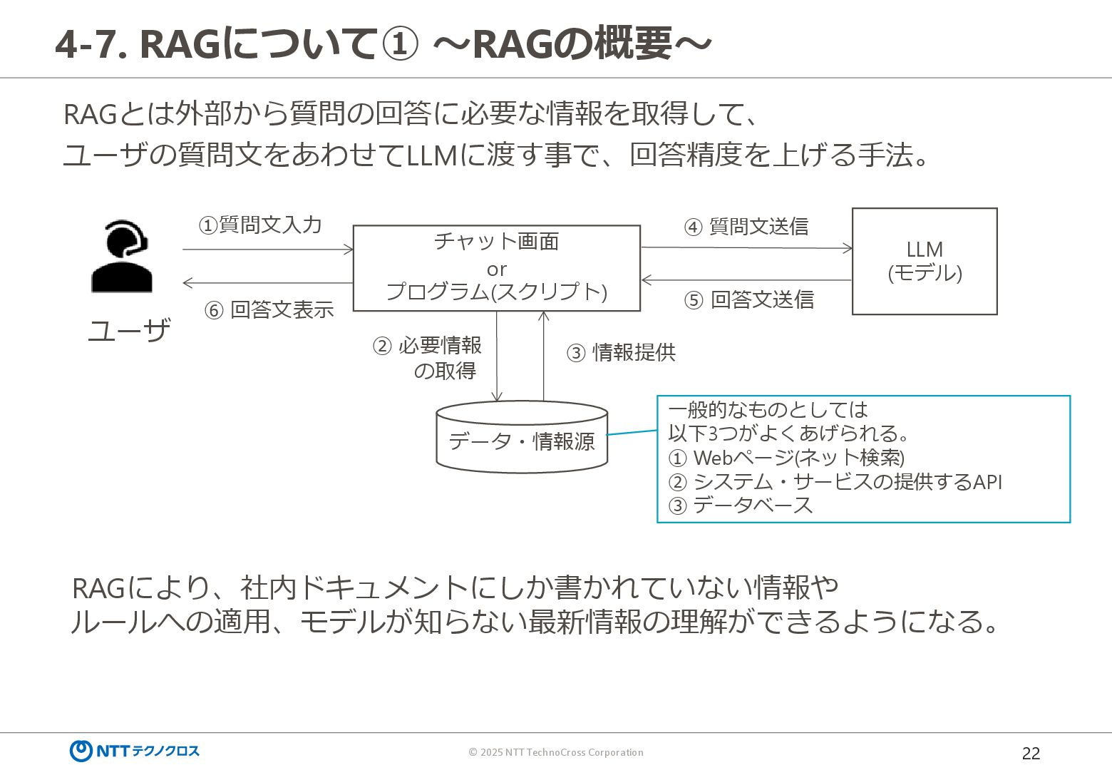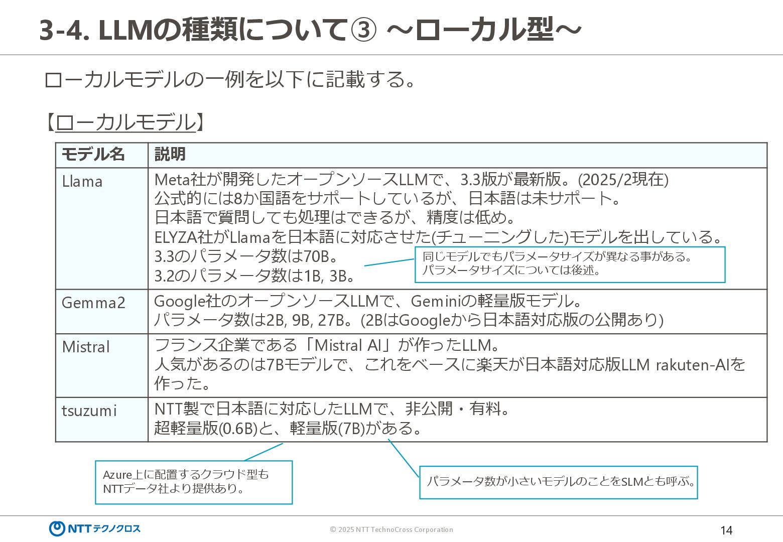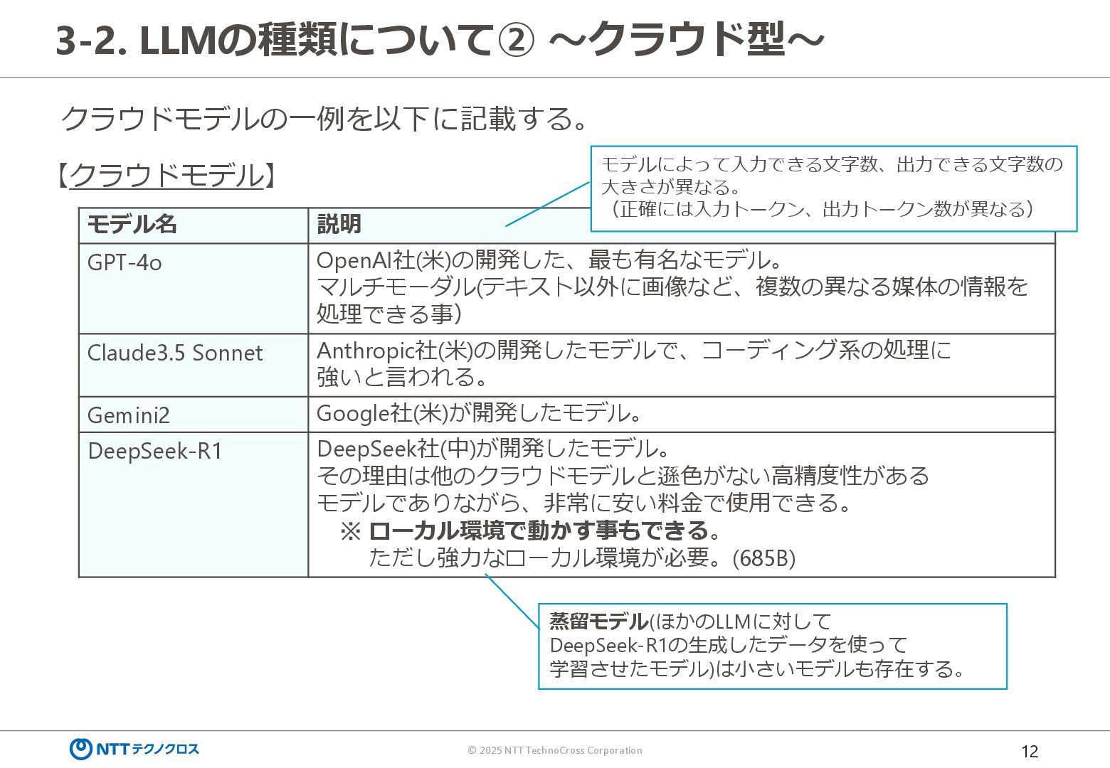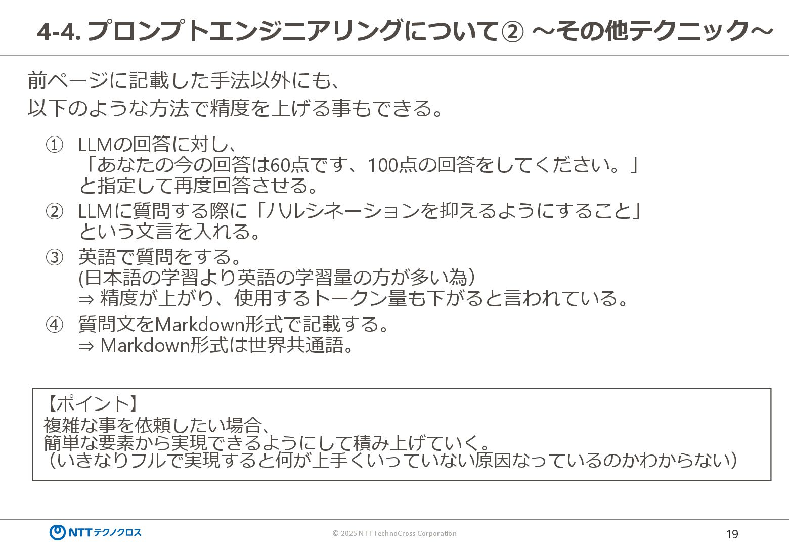 → 異なる言語で処理するLLMに「文字数」に関することを 聞いても上手く回答できないことが多い。 (同様の理由で計算も弱い) LLMの中の処理に注目すると以下のような流れ。 文字を分割 トークンID付与 ベクトル化 質問の処理 (質問の実行→回答出力) 【質問文】 あなたは誰。 “あなた”, “は”, “誰。” “0.01”, “0.41””… 分割した単語をトークンと呼び、 それぞれにトークンIDを付与する。 この処理を行うものをトークナイザーと 呼ぶ。 トークンIDをベクトル化(数値化)する。 “1111”, “2222”, “3333” 推論モデルの登場により 多少改善された。