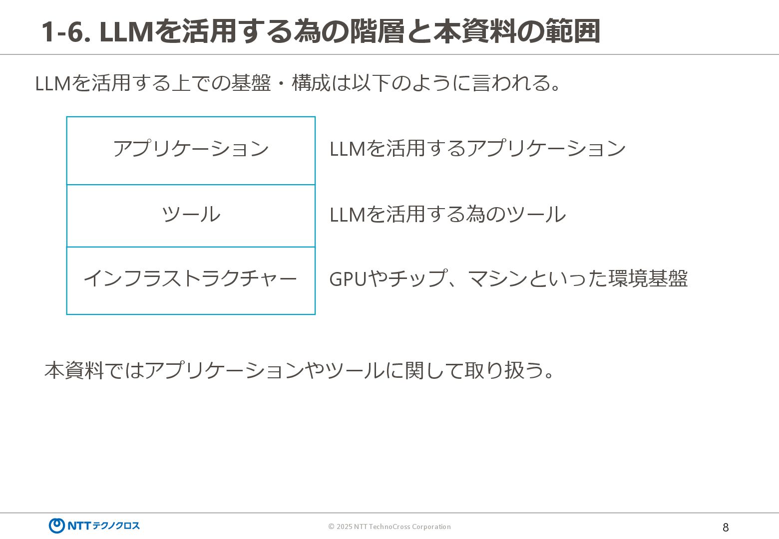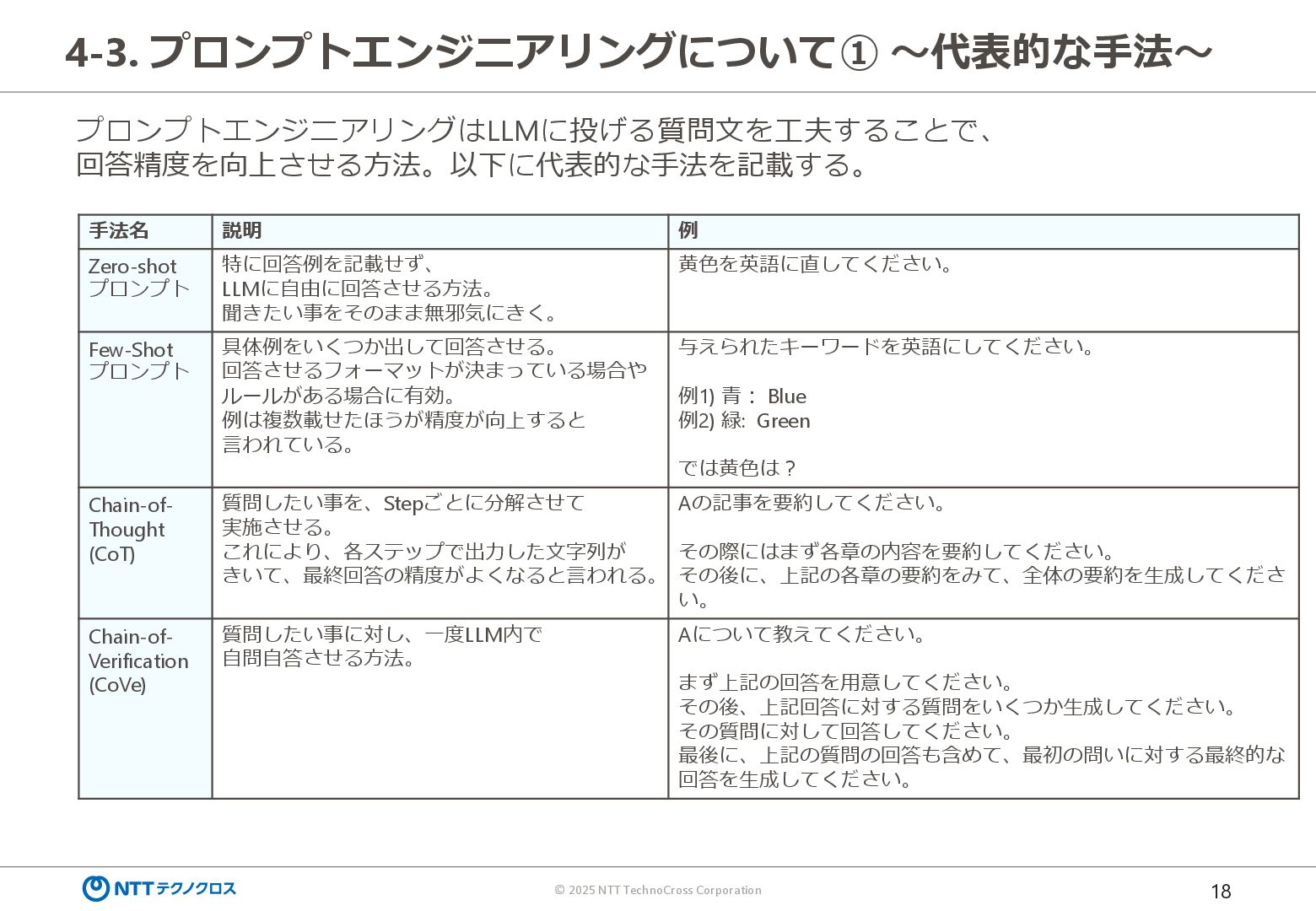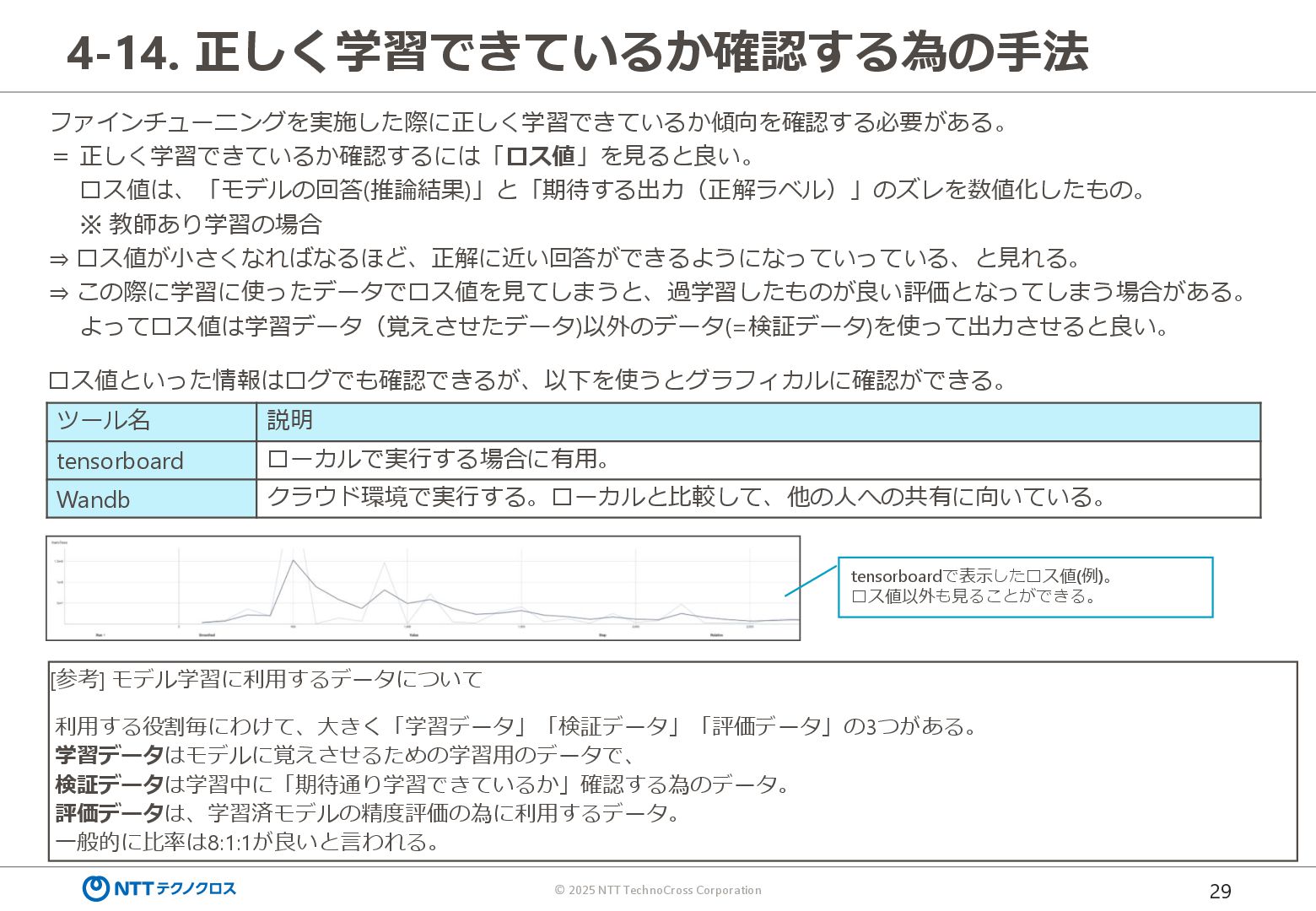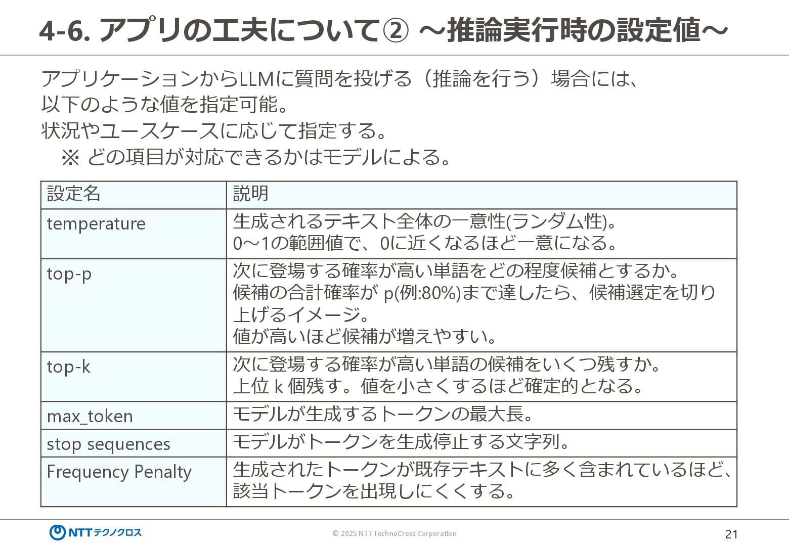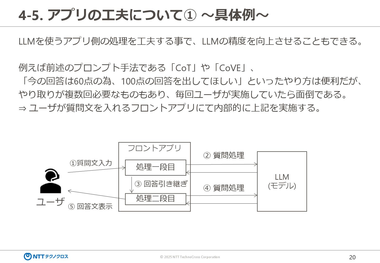 → 異なる言語で処理するLLMに「文字数」に関することを 聞いても上手く回答できないことが多い。 (同様の理由で計算も弱い) LLMの中の処理に注目すると以下のような流れ。 文字を分割 トークンID付与 ベクトル化 質問の処理 (質問の実行→回答出力) 【質問文】 あなたは誰。 “あなた”, “は”, “誰。” “0.01”, “0.41””… 分割した単語をトークンと呼び、 それぞれにトークンIDを付与する。 この処理を行うものをトークナイザーと 呼ぶ。 トークンIDをベクトル化(数値化)する。 “1111”, “2222”, “3333” 推論モデルの登場により 多少改善された。