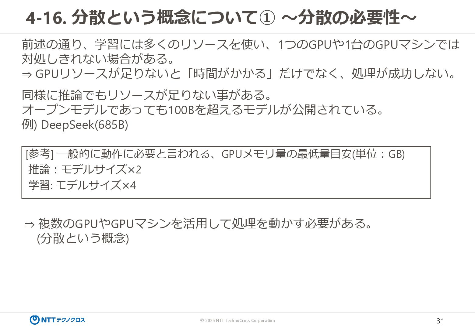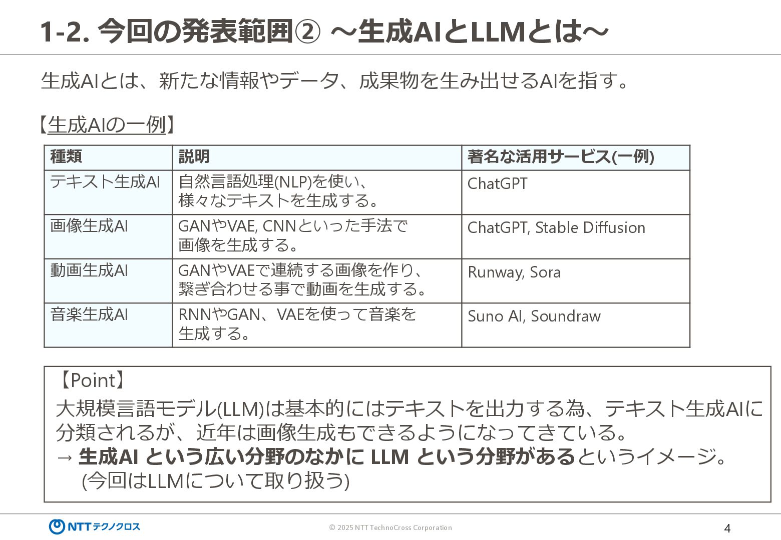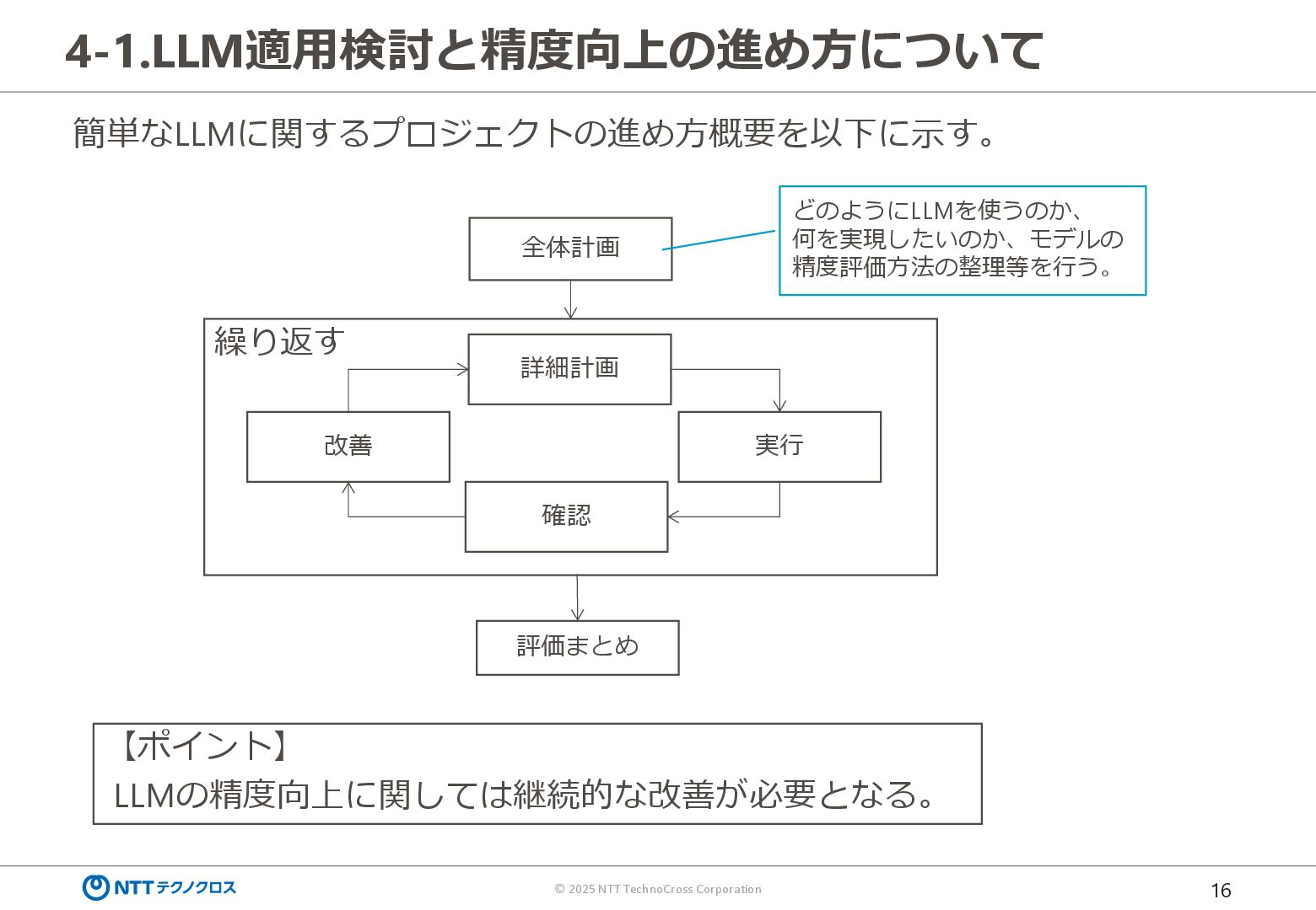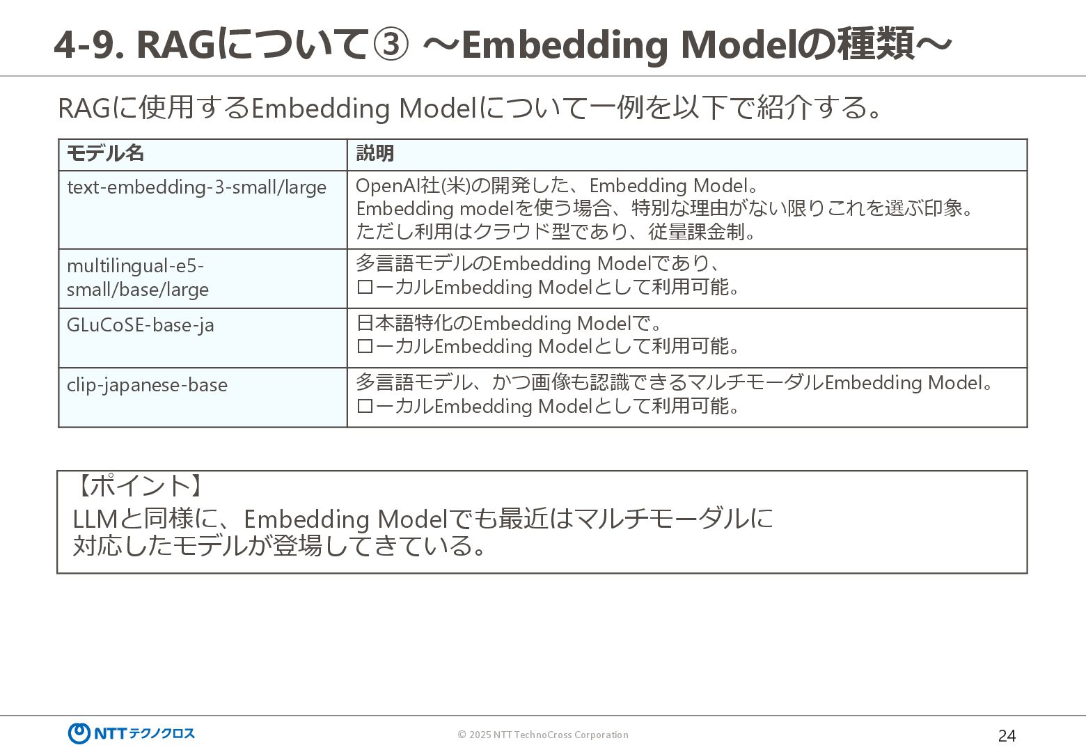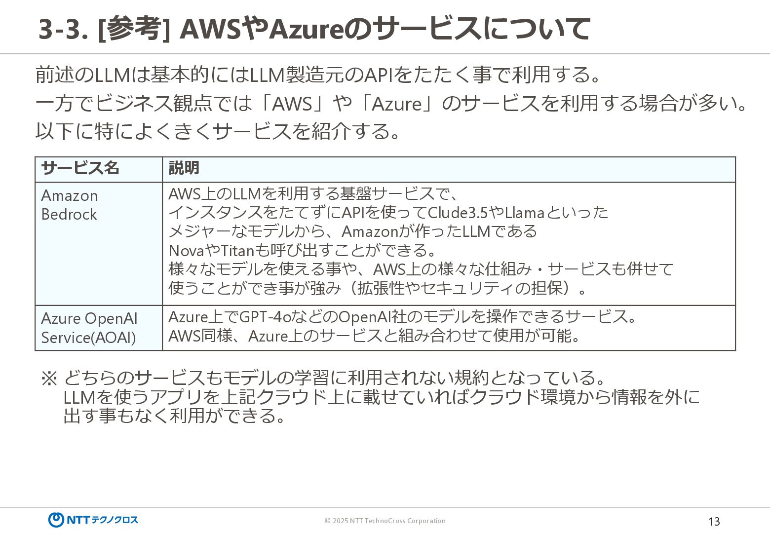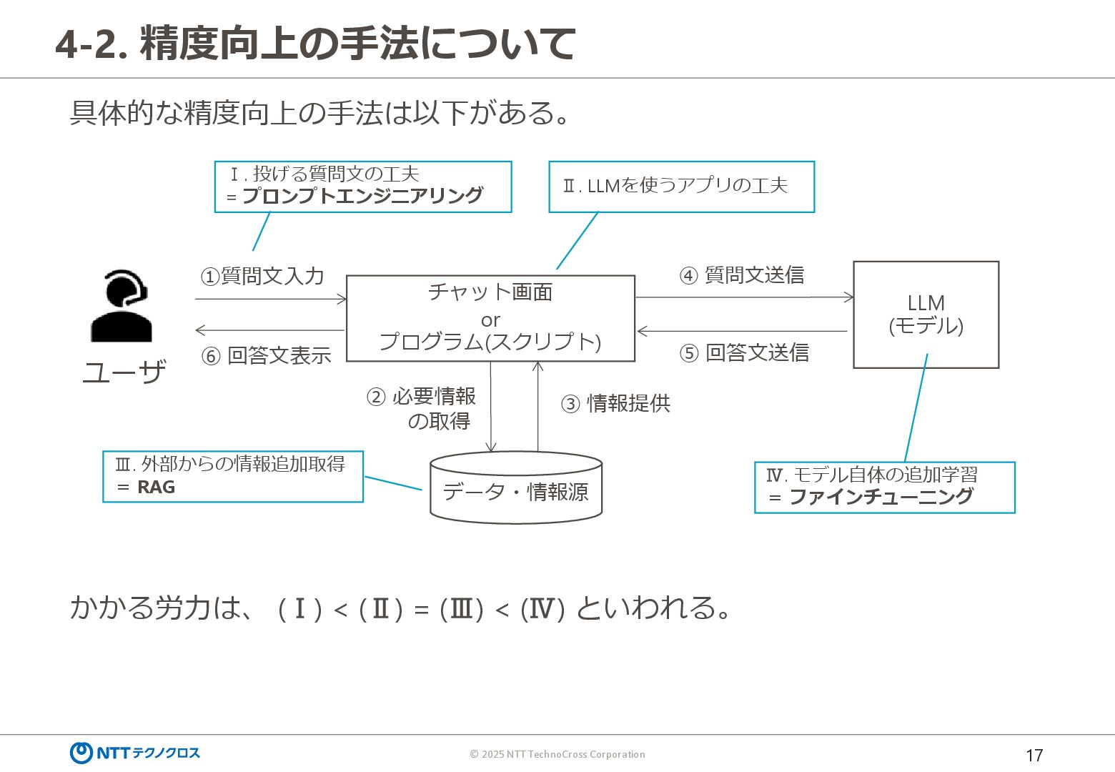 → 異なる言語で処理するLLMに「文字数」に関することを 聞いても上手く回答できないことが多い。 (同様の理由で計算も弱い) LLMの中の処理に注目すると以下のような流れ。 文字を分割 トークンID付与 ベクトル化 質問の処理 (質問の実行→回答出力) 【質問文】 あなたは誰。 “あなた”, “は”, “誰。” “0.01”, “0.41””… 分割した単語をトークンと呼び、 それぞれにトークンIDを付与する。 この処理を行うものをトークナイザーと 呼ぶ。 トークンIDをベクトル化(数値化)する。 “1111”, “2222”, “3333” 推論モデルの登場により 多少改善された。