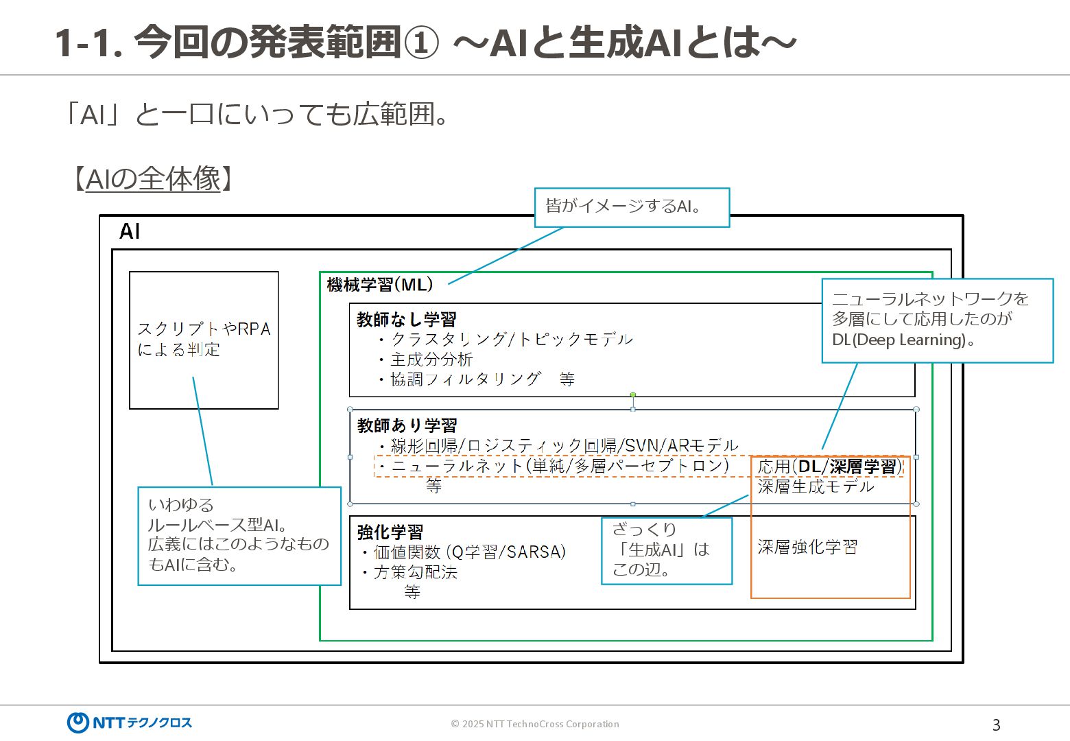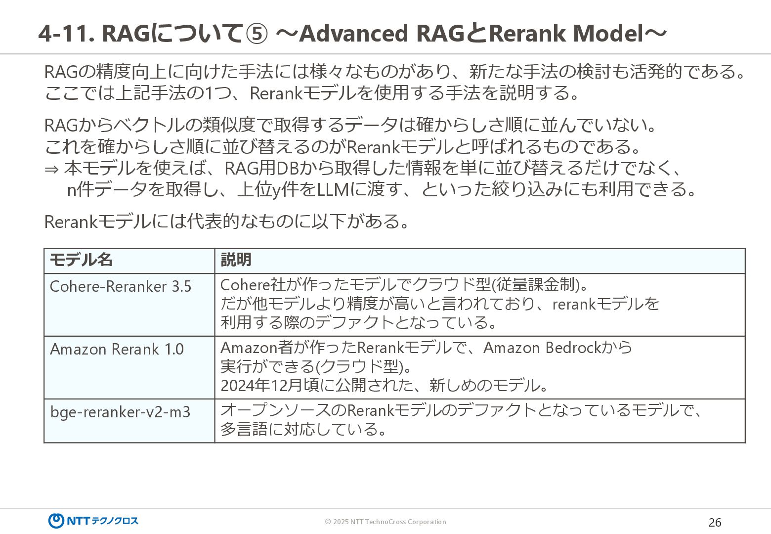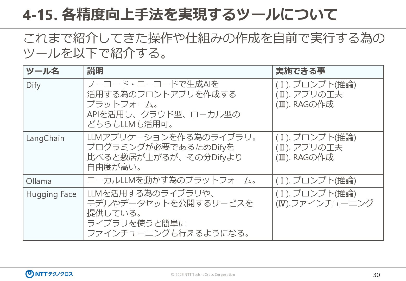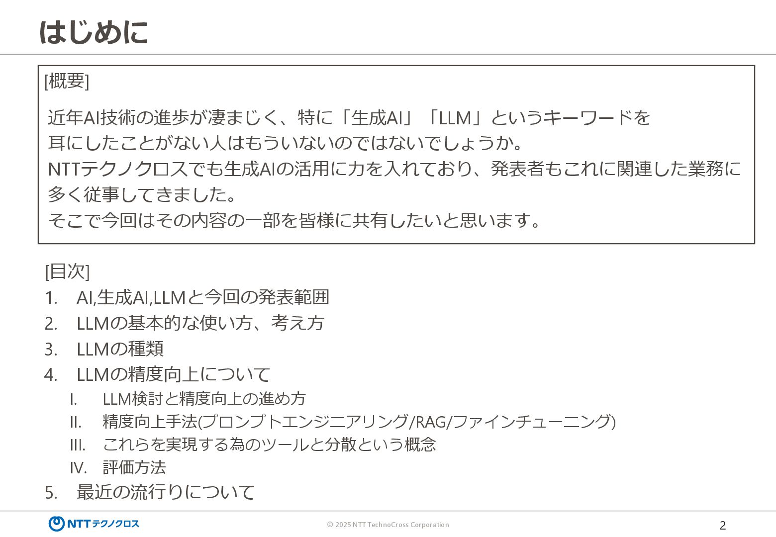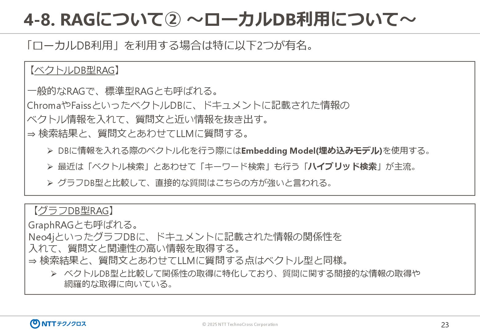 → 異なる言語で処理するLLMに「文字数」に関することを 聞いても上手く回答できないことが多い。 (同様の理由で計算も弱い) LLMの中の処理に注目すると以下のような流れ。 文字を分割 トークンID付与 ベクトル化 質問の処理 (質問の実行→回答出力) 【質問文】 あなたは誰。 “あなた”, “は”, “誰。” “0.01”, “0.41””… 分割した単語をトークンと呼び、 それぞれにトークンIDを付与する。 この処理を行うものをトークナイザーと 呼ぶ。 トークンIDをベクトル化(数値化)する。 “1111”, “2222”, “3333” 推論モデルの登場により 多少改善された。