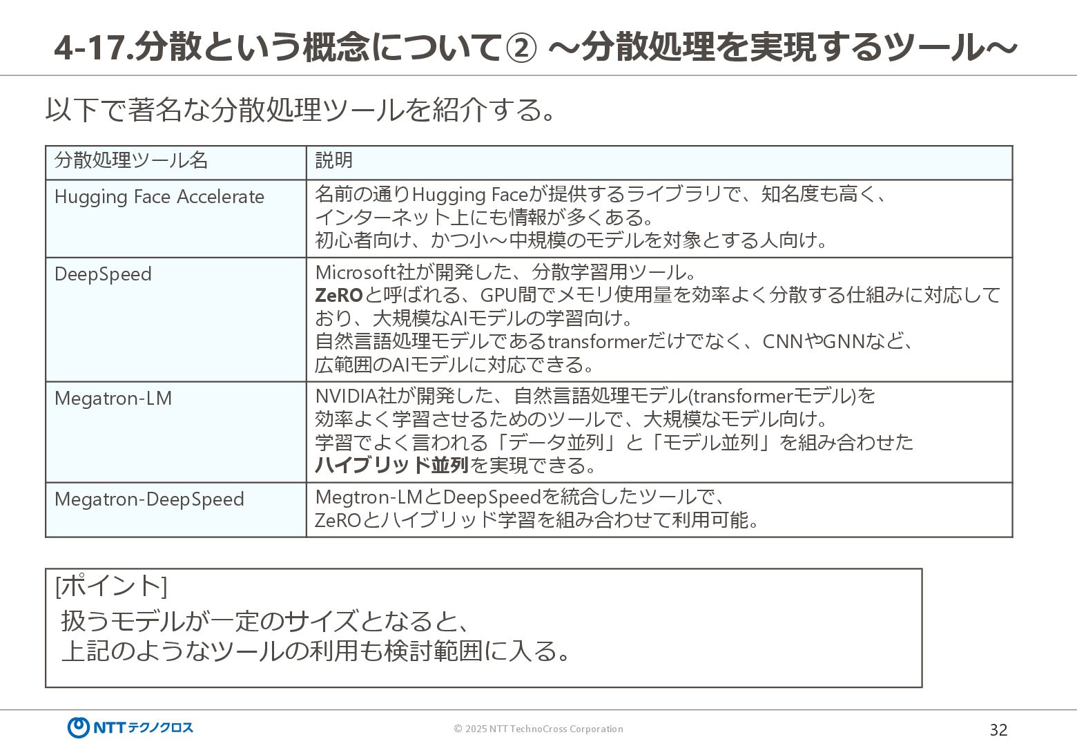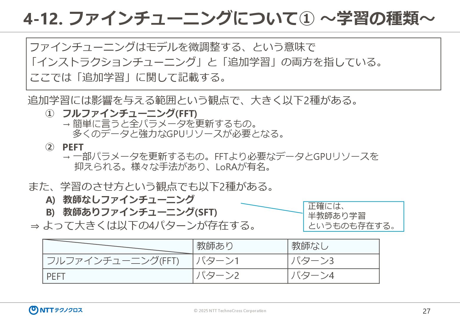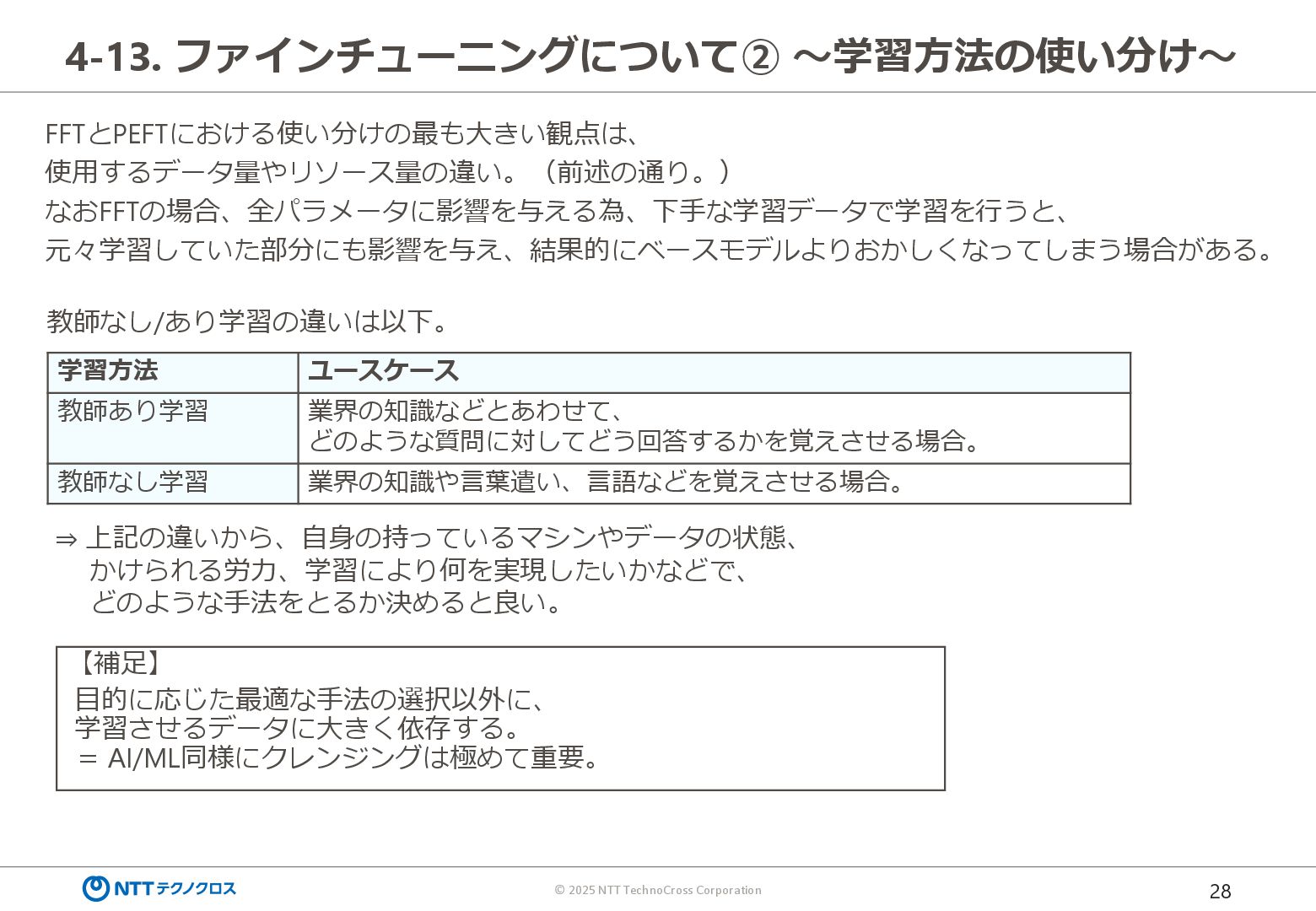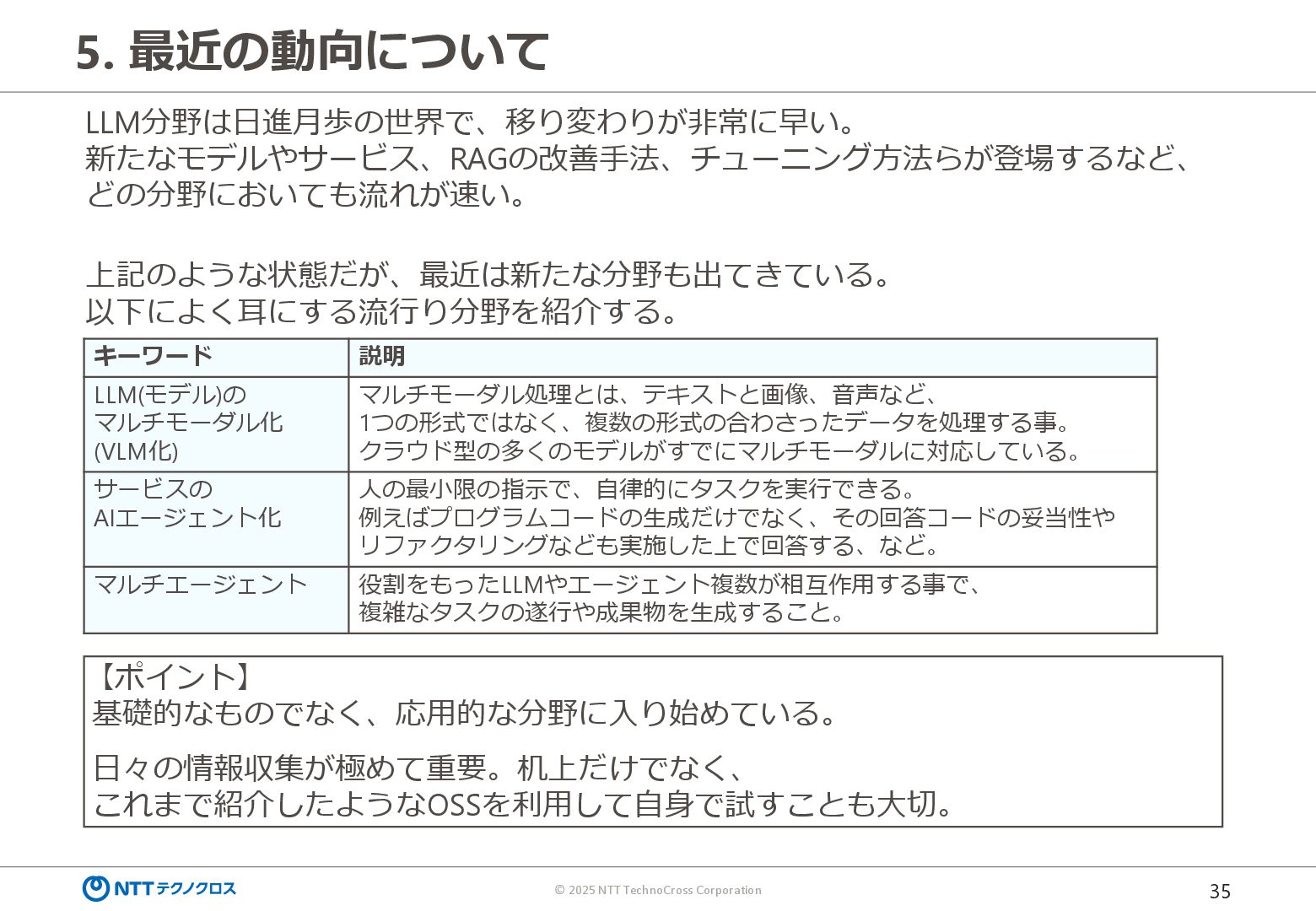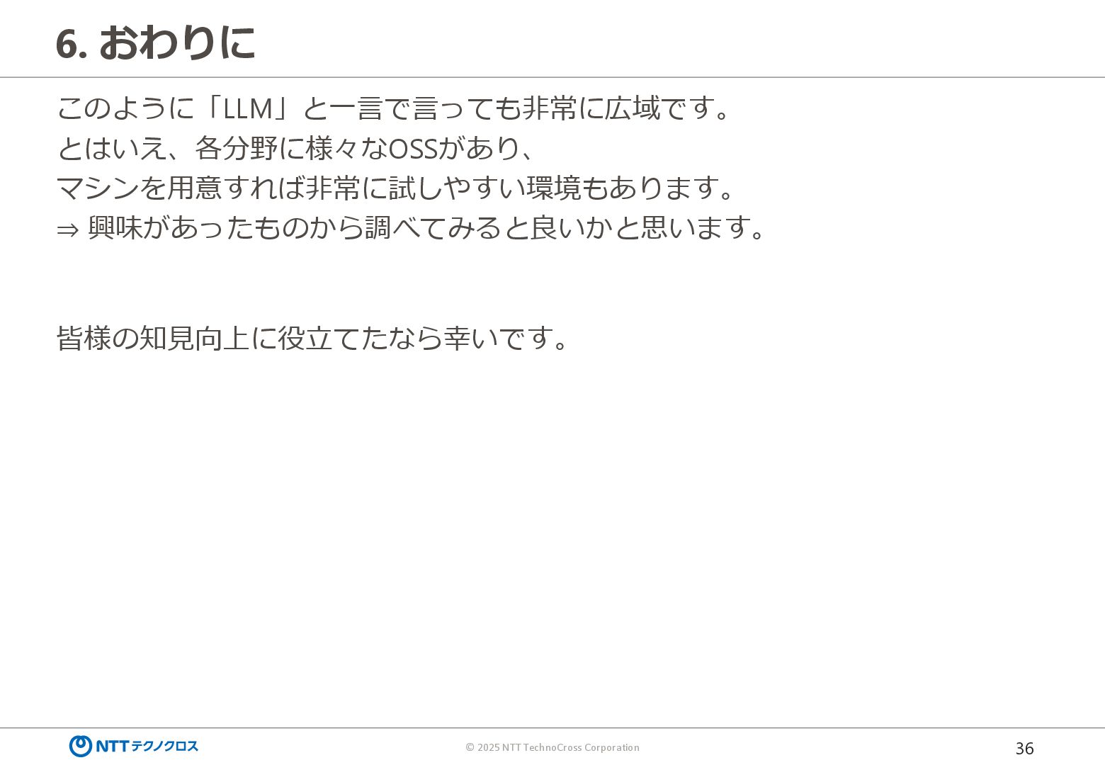 → 異なる言語で処理するLLMに「文字数」に関することを 聞いても上手く回答できないことが多い。 (同様の理由で計算も弱い) LLMの中の処理に注目すると以下のような流れ。 文字を分割 トークンID付与 ベクトル化 質問の処理 (質問の実行→回答出力) 【質問文】 あなたは誰。 “あなた”, “は”, “誰。” “0.01”, “0.41””… 分割した単語をトークンと呼び、 それぞれにトークンIDを付与する。 この処理を行うものをトークナイザーと 呼ぶ。 トークンIDをベクトル化(数値化)する。 “1111”, “2222”, “3333” 推論モデルの登場により 多少改善された。