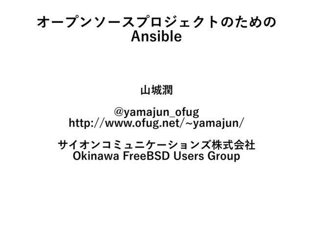 オープンソースプロジェクトのための Ansible 山城潤 @yamajun_ofug http://www.ofug.net/~yamajun/ サイオンコミュニケーションズ株式会社 Okinawa FreeBSD Users Group