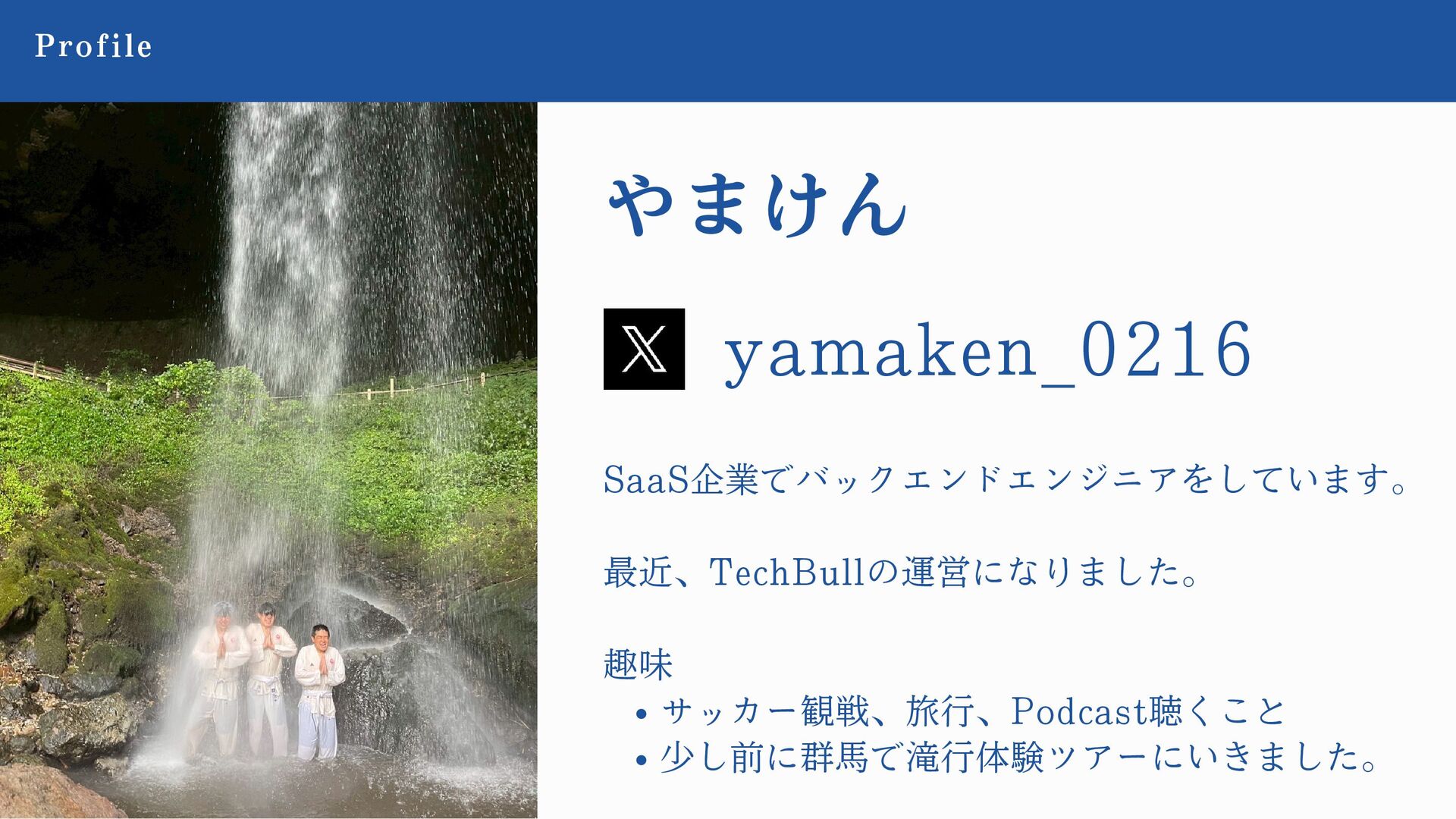 やまけん Profile SaaS企業でバックエンドエンジニアをしています。 最近、TechBullの運営になりました。 趣味 サッカー観戦、旅行、Podcast聴くこと 少し前に群馬で滝行体験ツアーにいきました。 yamaken_0216