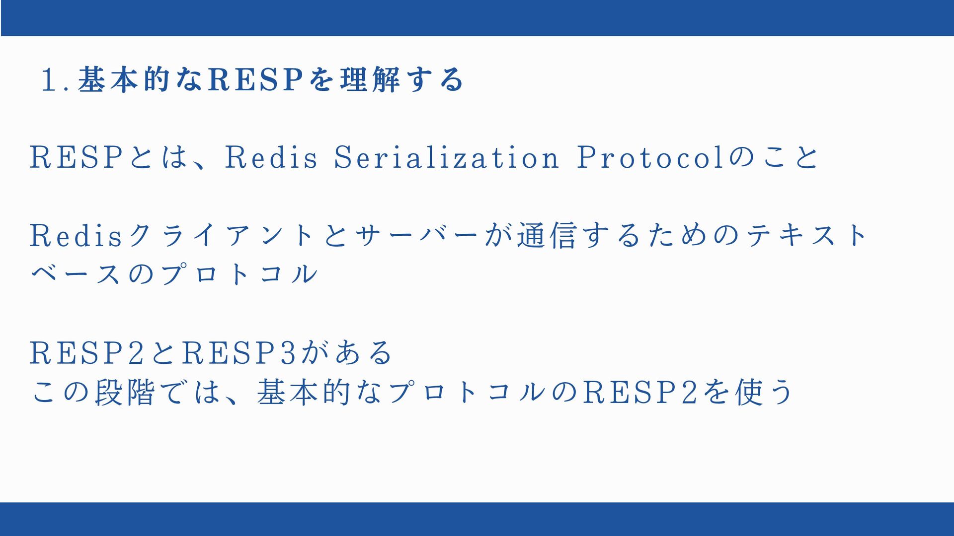 1 . 基本的なRESPを理解する RESPとは、Redis Serialization Protocolのこと Redisクライアントとサーバーが通信するためのテキスト ベースのプロトコル RESP2とRESP3がある この段階では、基本的なプロトコルのRESP2を使う