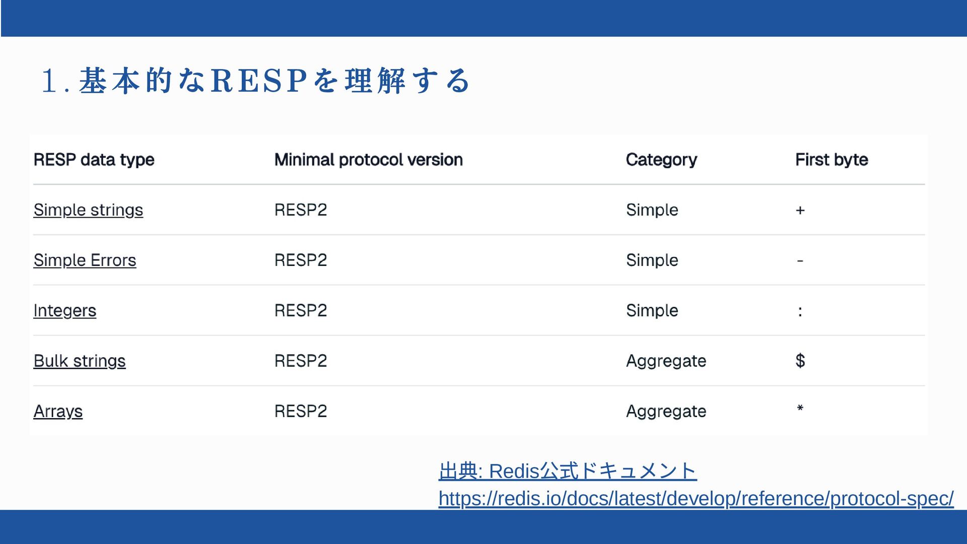 1 . 基本的なRESPを理解する 出典: Redis 公式ドキュメント https://redis.io/docs/latest/develop/reference/protocol-spec/