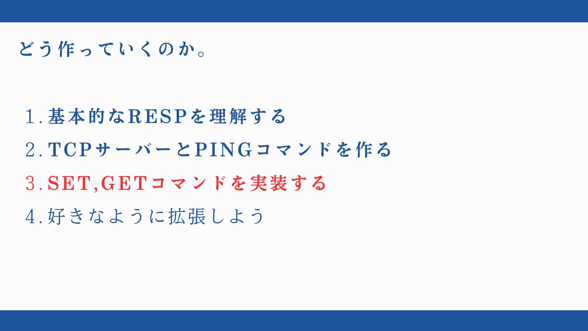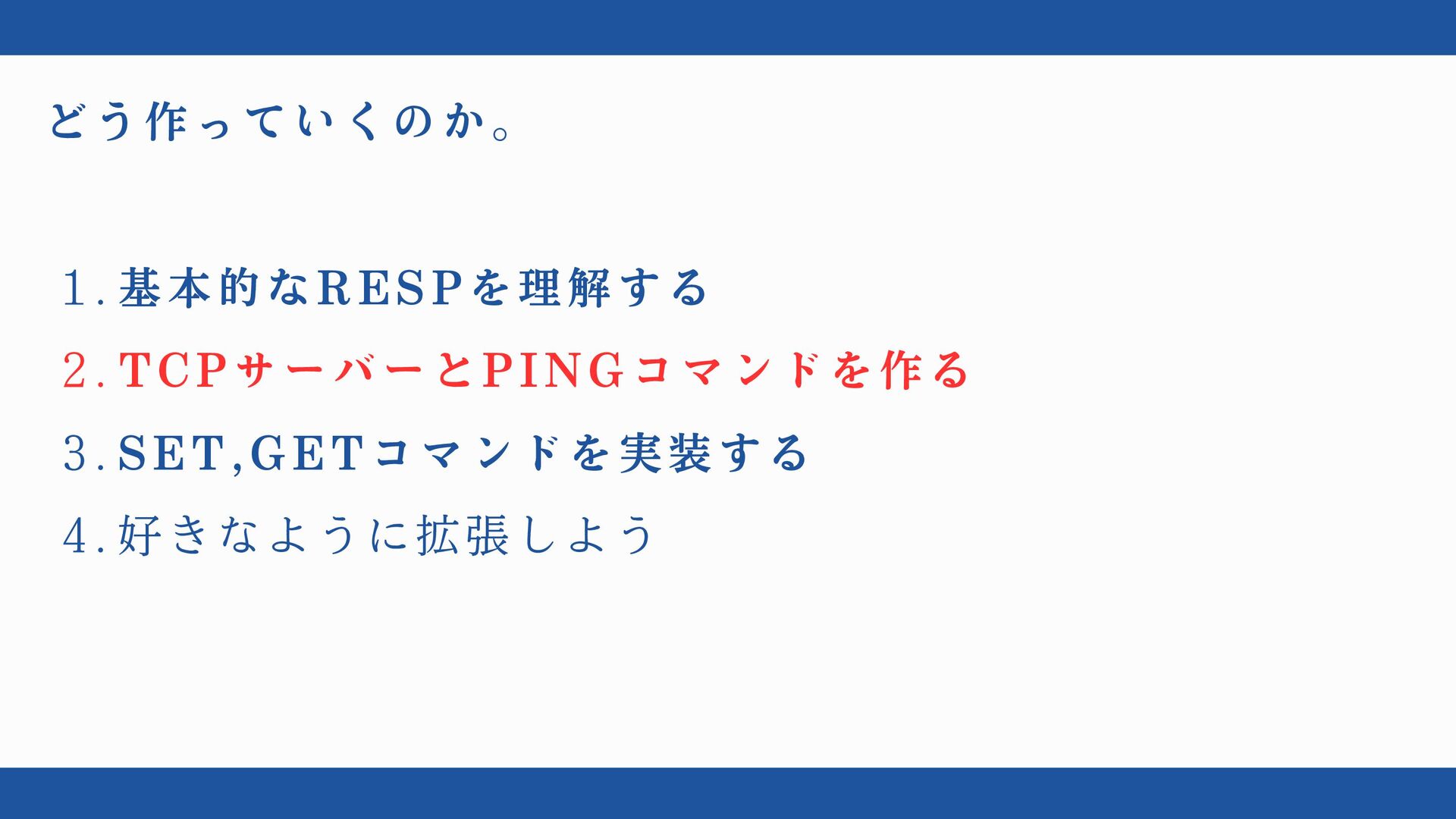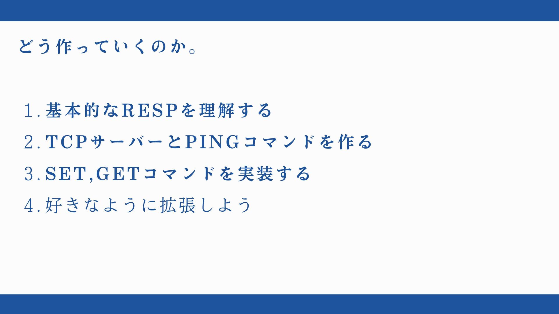 どう作っていくのか。 1. 基本的なRESPを理解する 2. TCPサーバーとPINGコマンドを作る 3. SET,GETコマンドを実装する 4. 好きなように拡張しよう