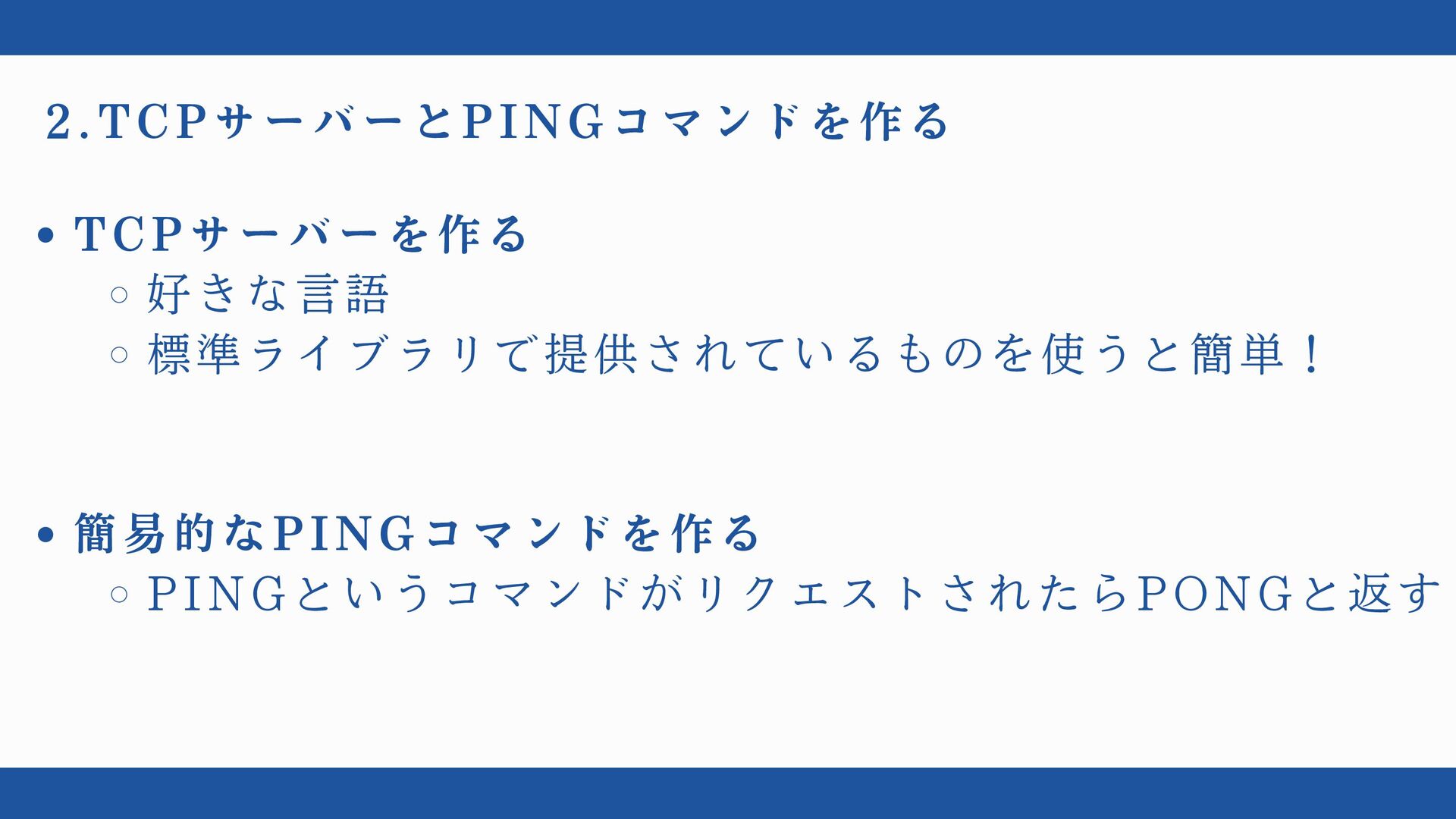 2.TCPサーバーとPINGコマンドを作る TCPサーバーを作る 好きな言語 標準ライブラリで提供されているものを使うと簡単! 簡易的なPINGコマンドを作る PINGというコマンドがリクエストされたらPONGと返す