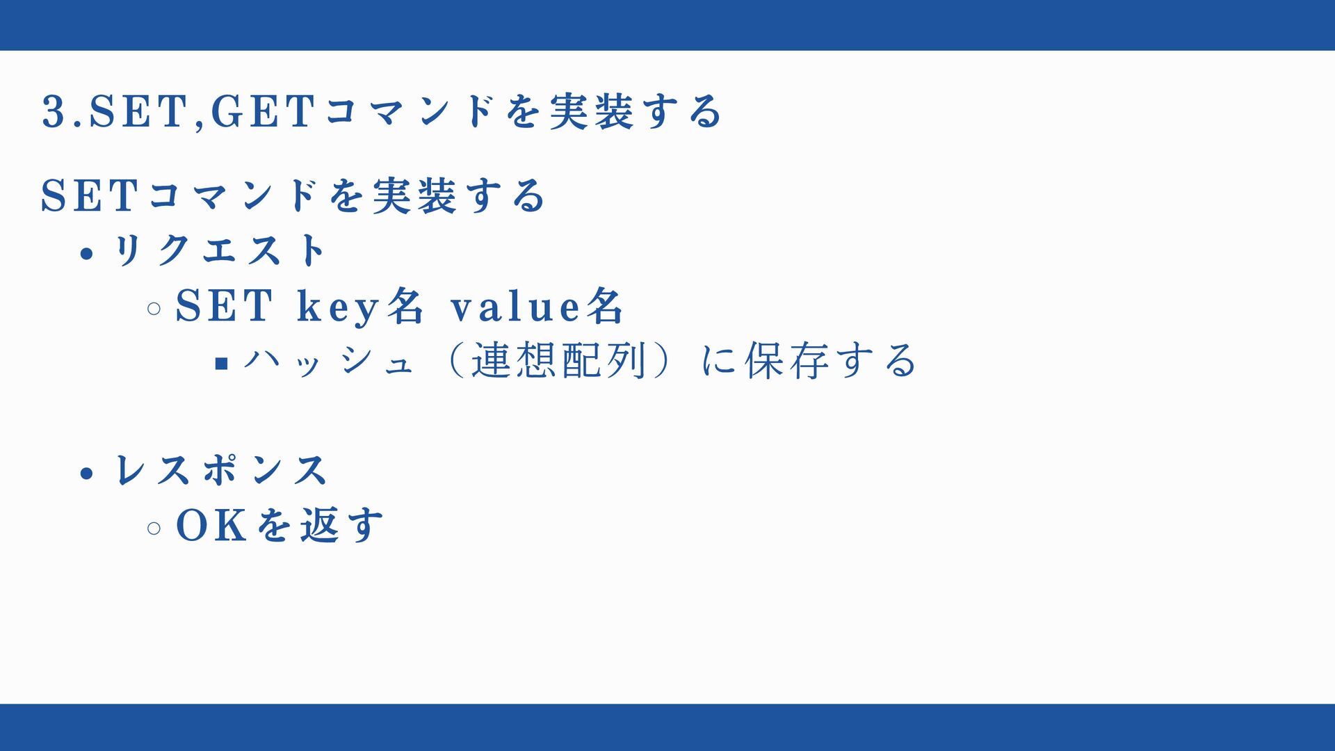 3.SET,GETコマンドを実装する SETコマンドを実装する リクエスト SET key名 value名 ハッシュ(連想配列)に保存する レスポンス OKを返す